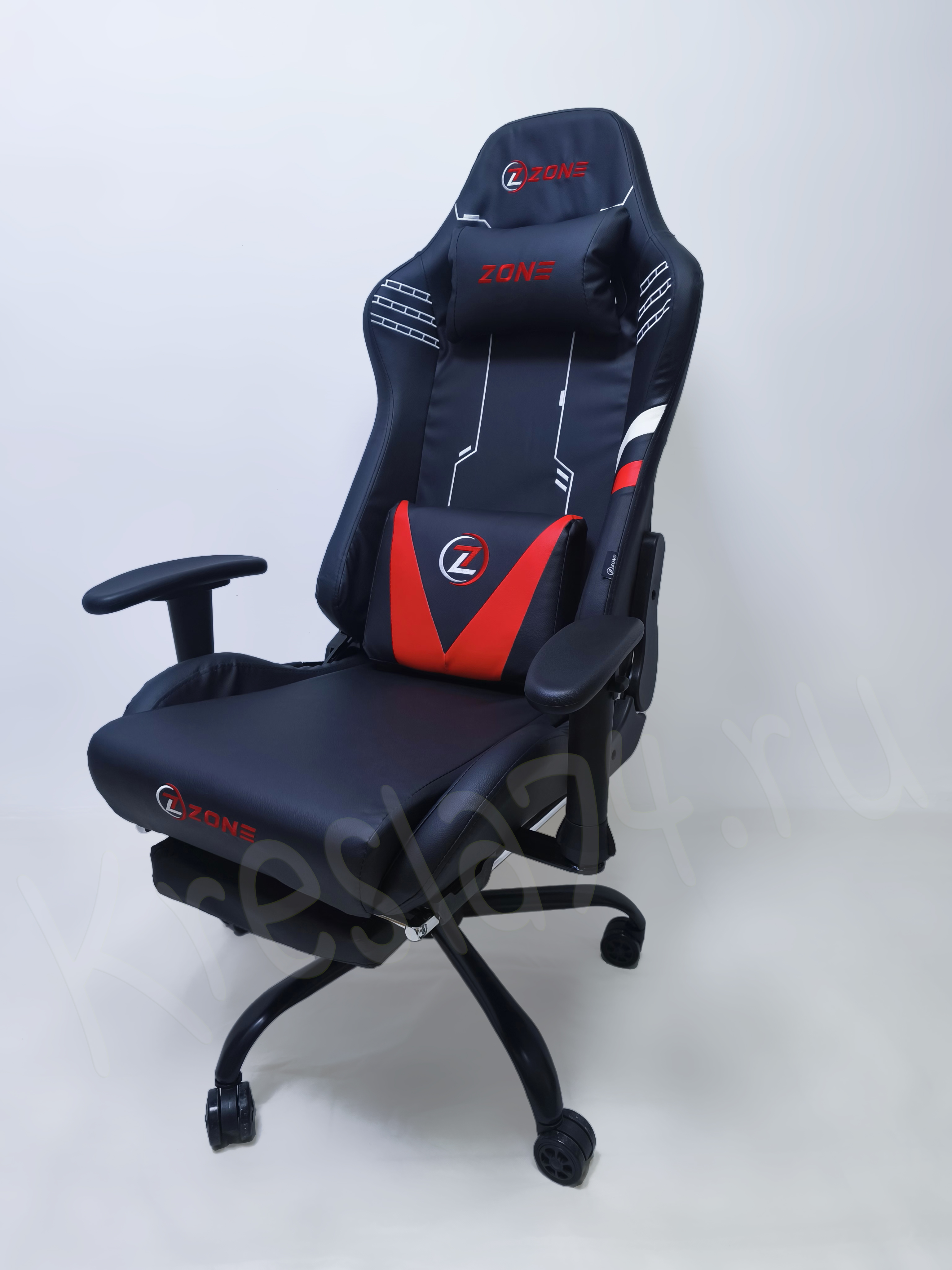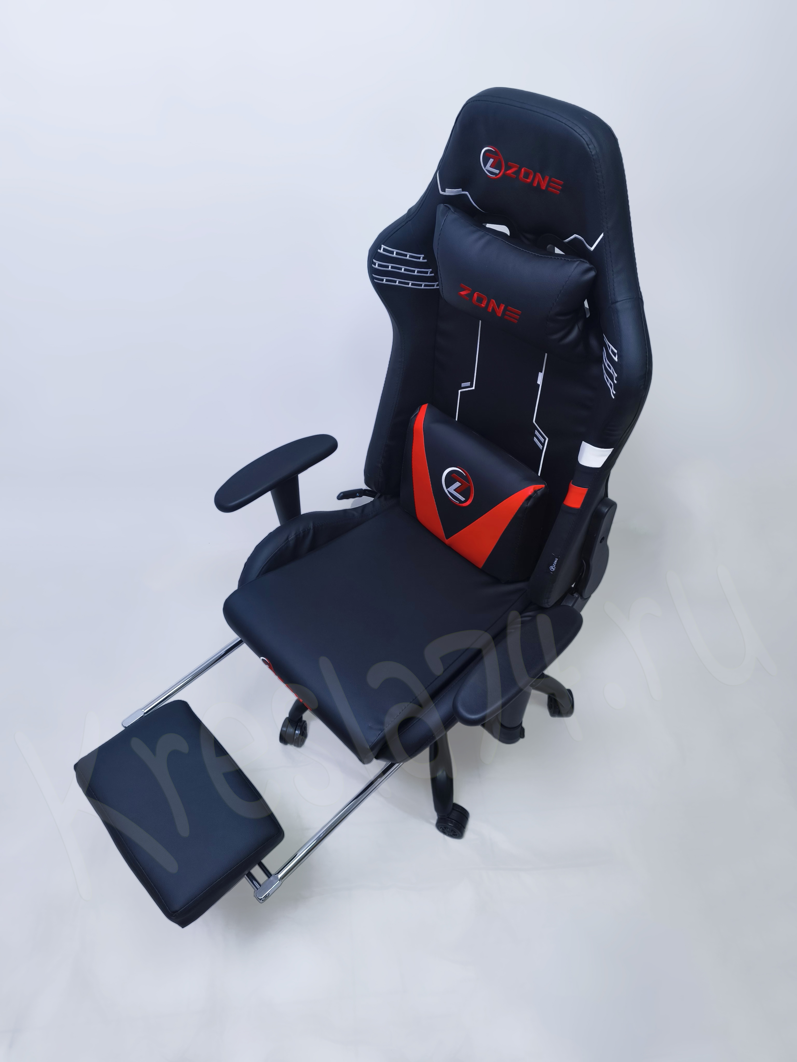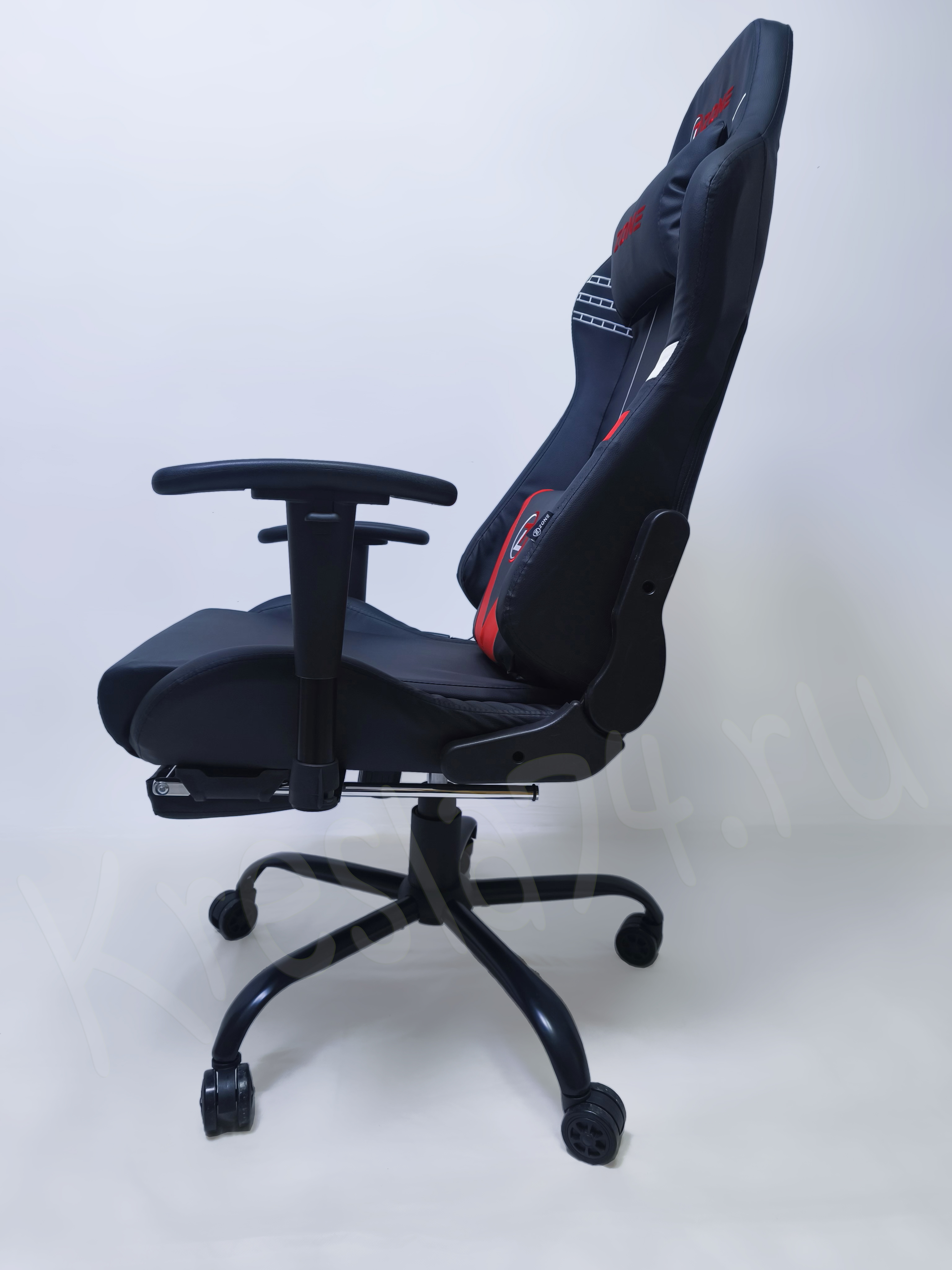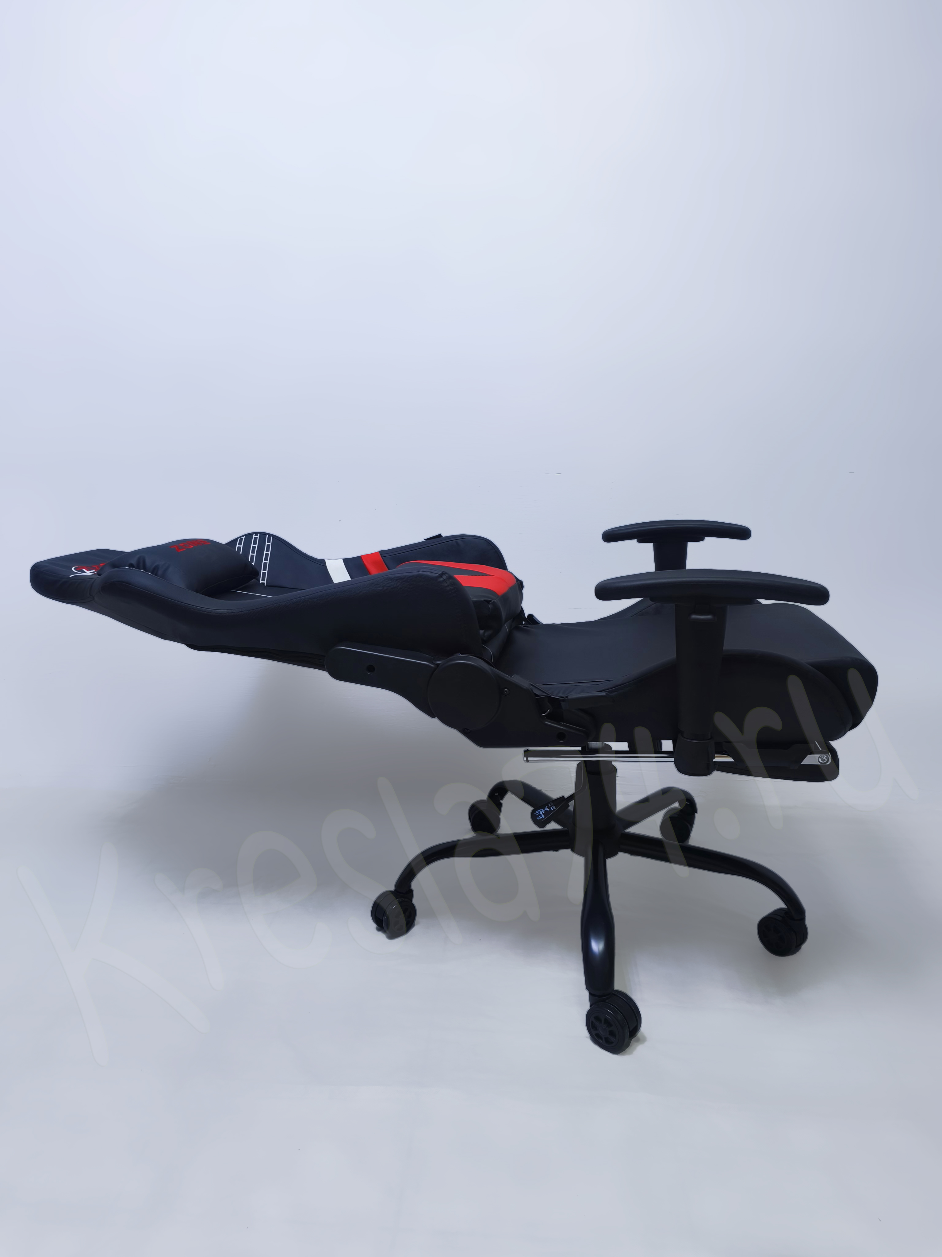 Эргономичное геймерское кресло черного цвета с красными и белыми вставками из эко кожи, с подножкой, подушкой под голову, подушкой под поясницу и режимом качания.