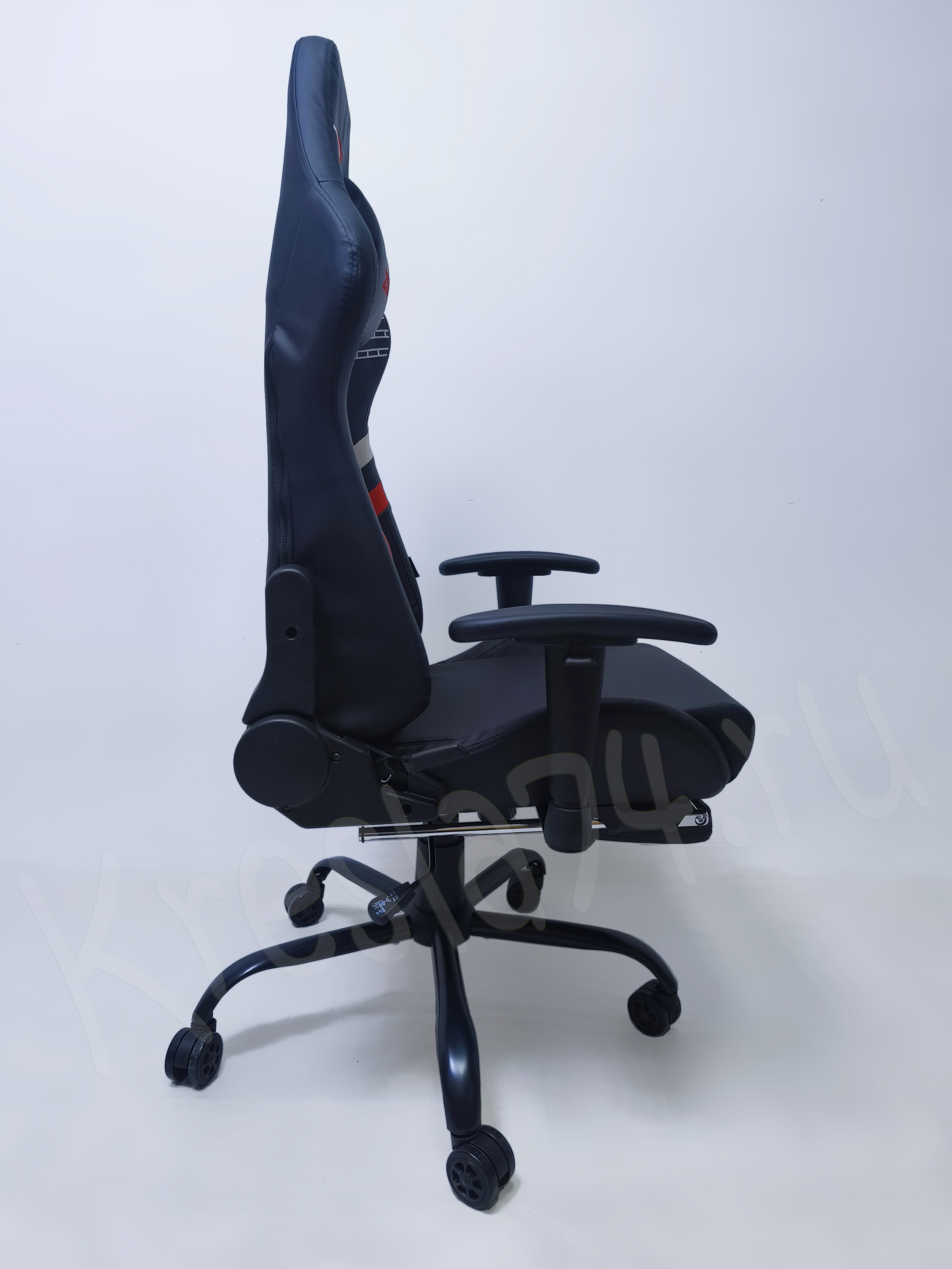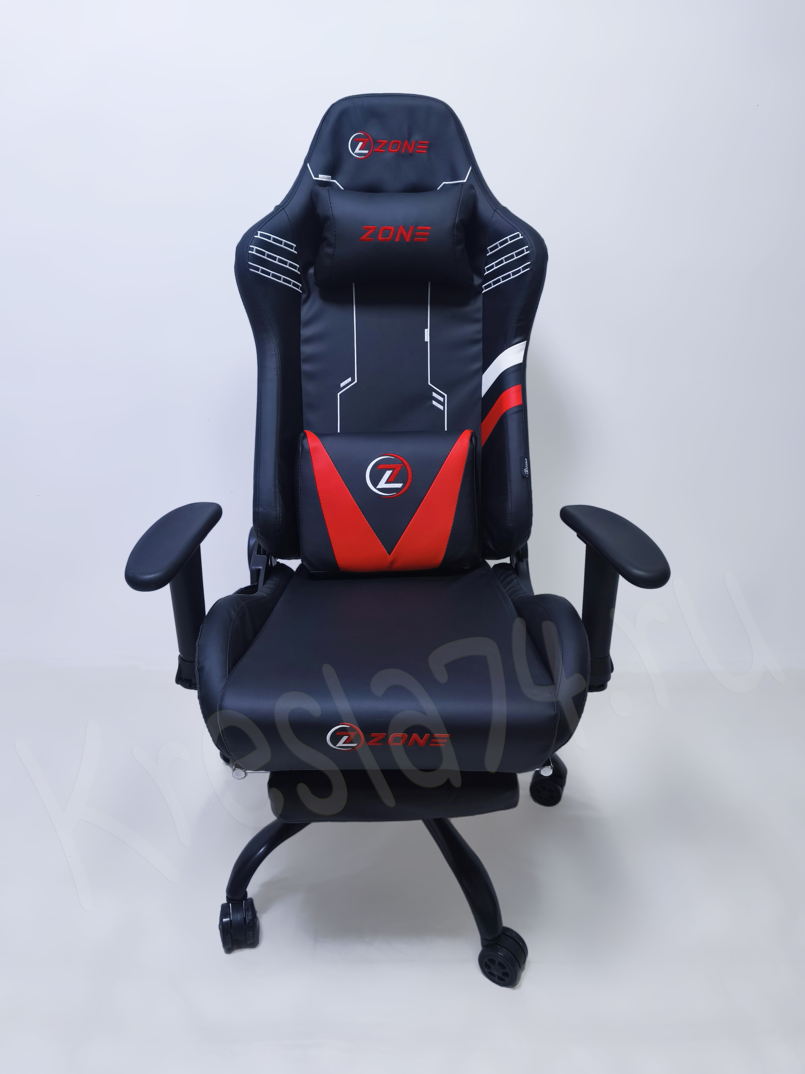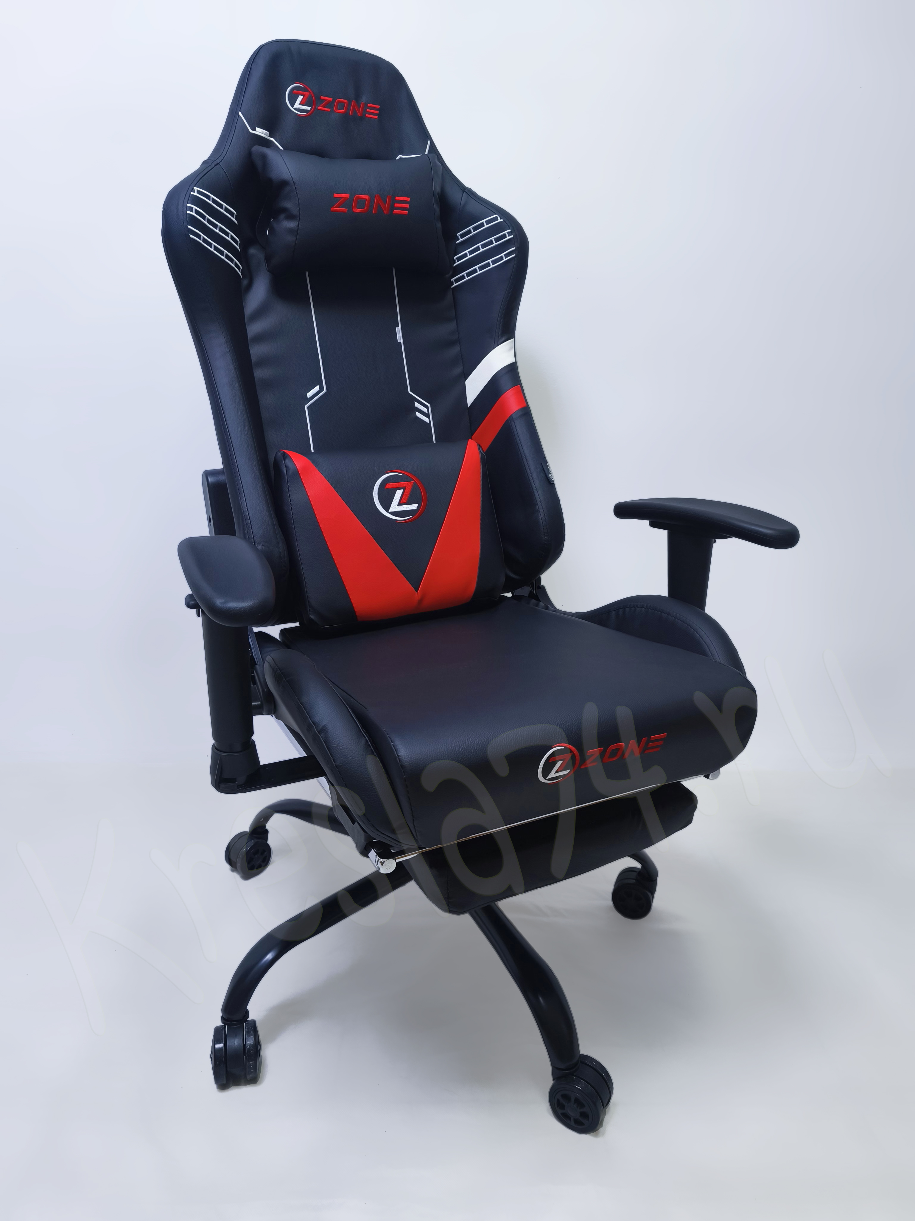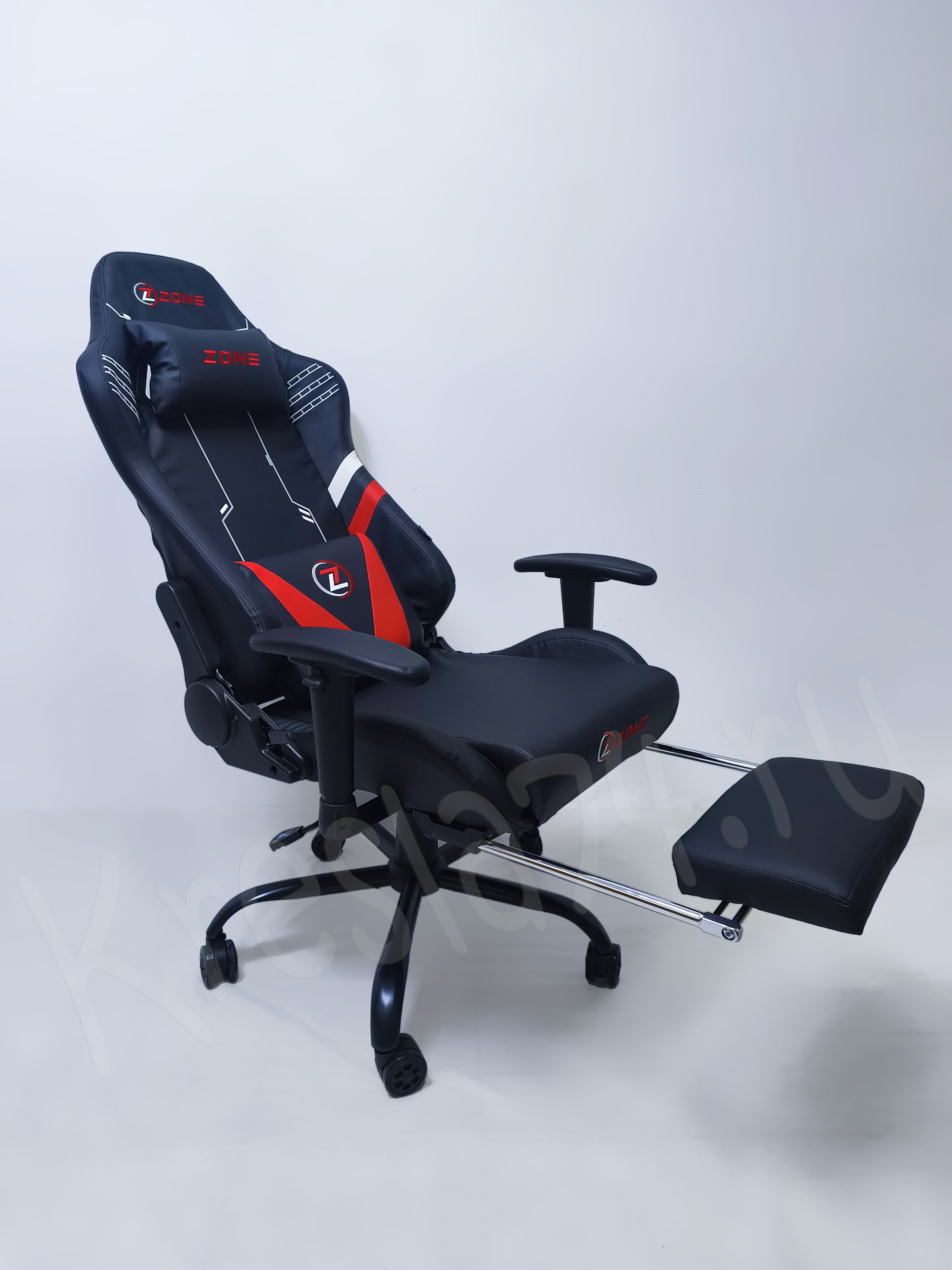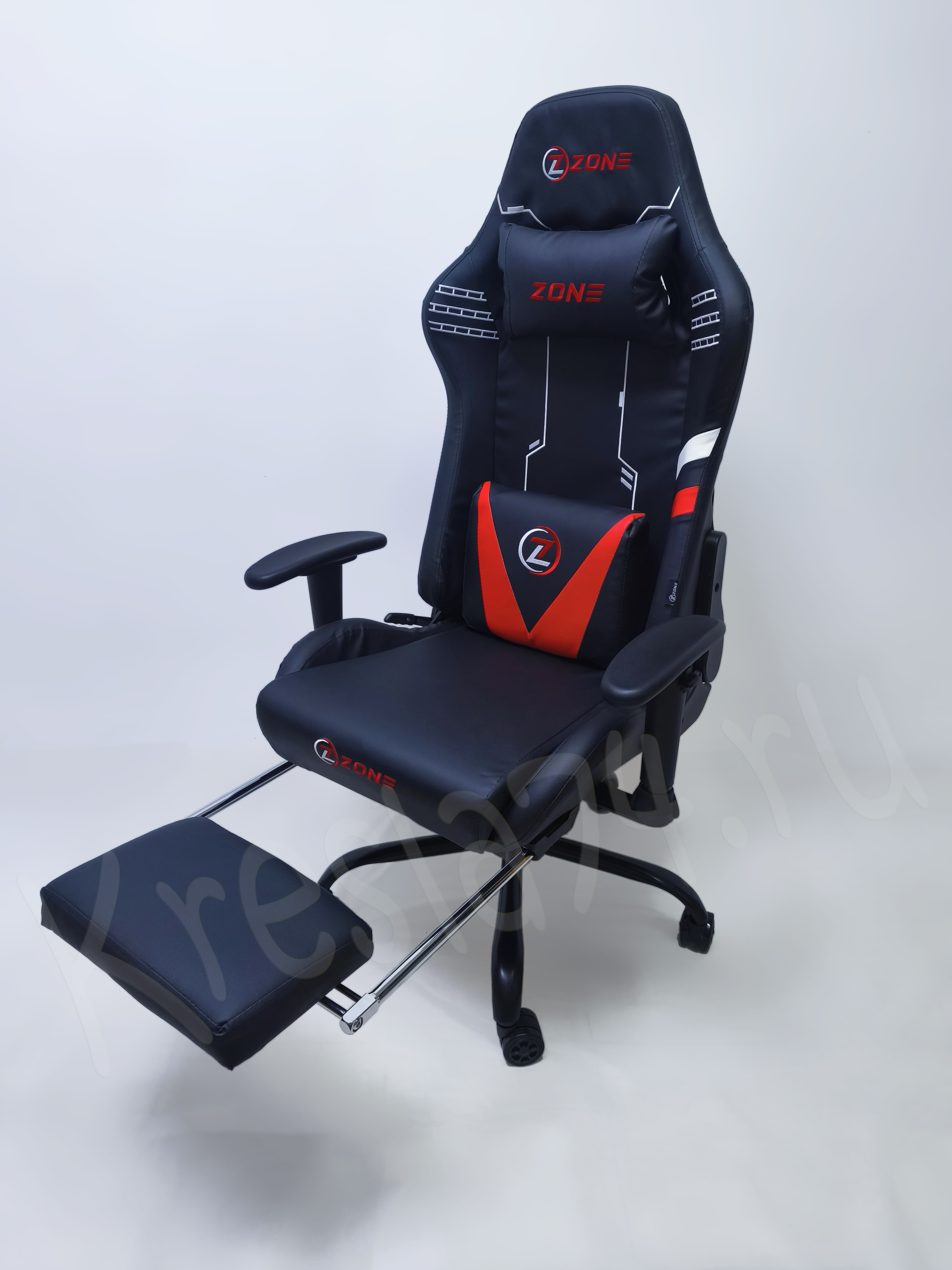Эргономичное геймерское кресло черного цвета с красными и белыми вставками из эко кожи, с подножкой, подушкой под голову, подушкой под поясницу и режимом качания.