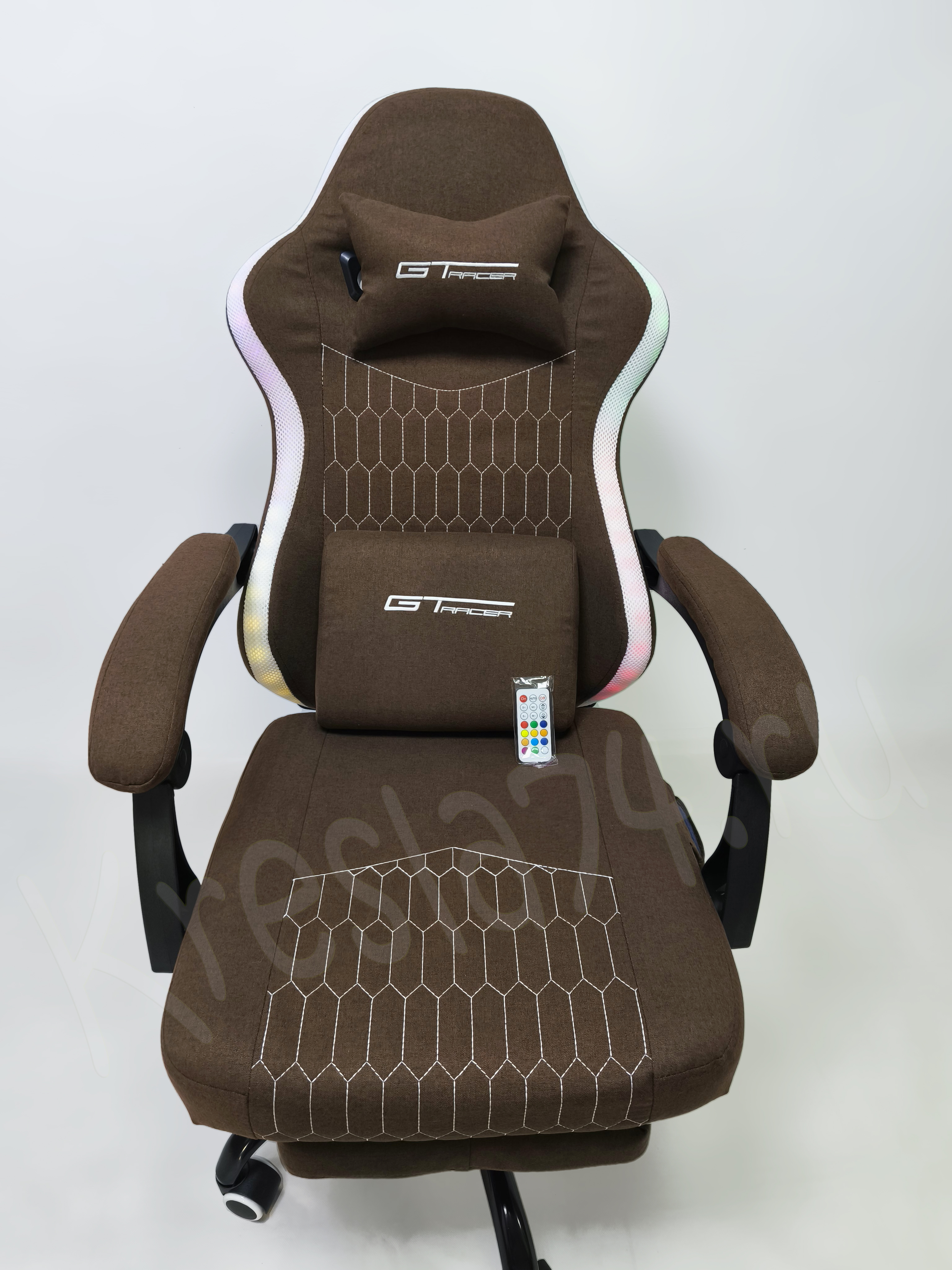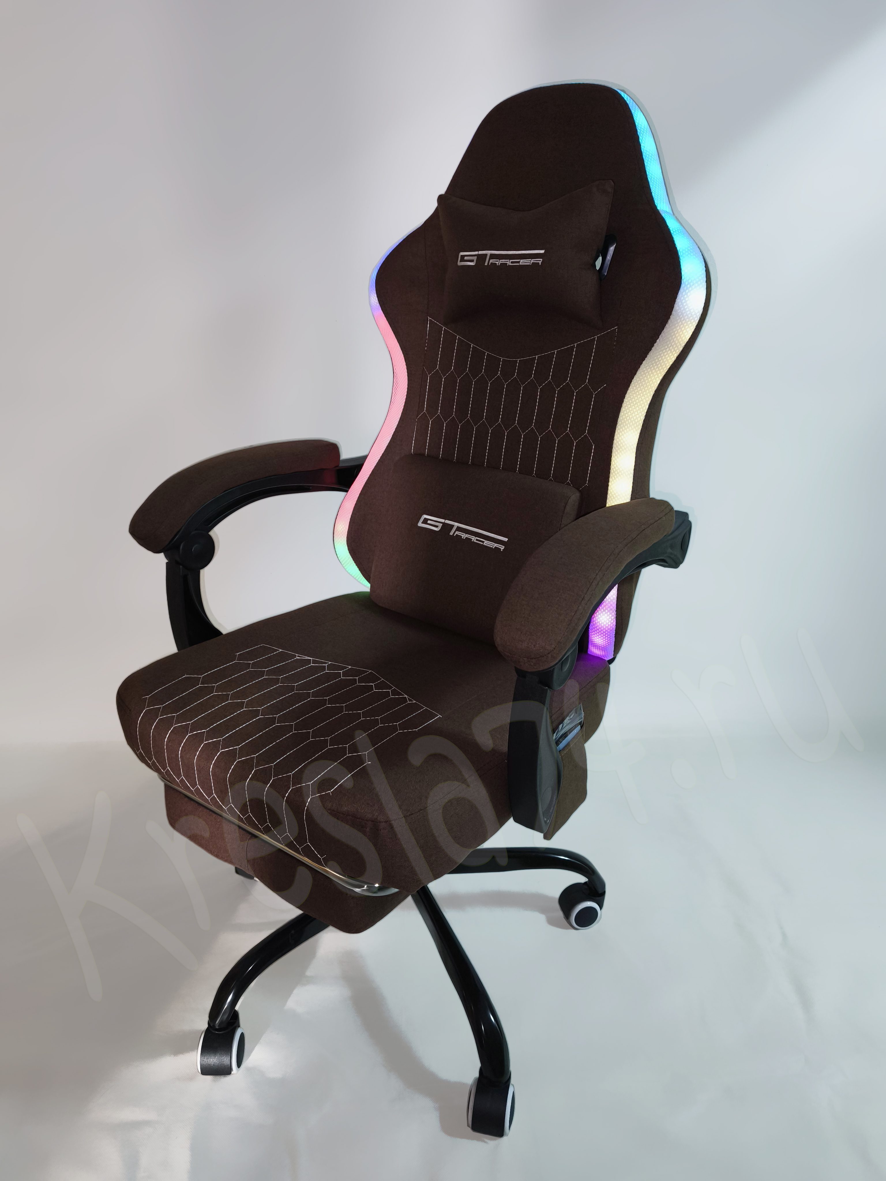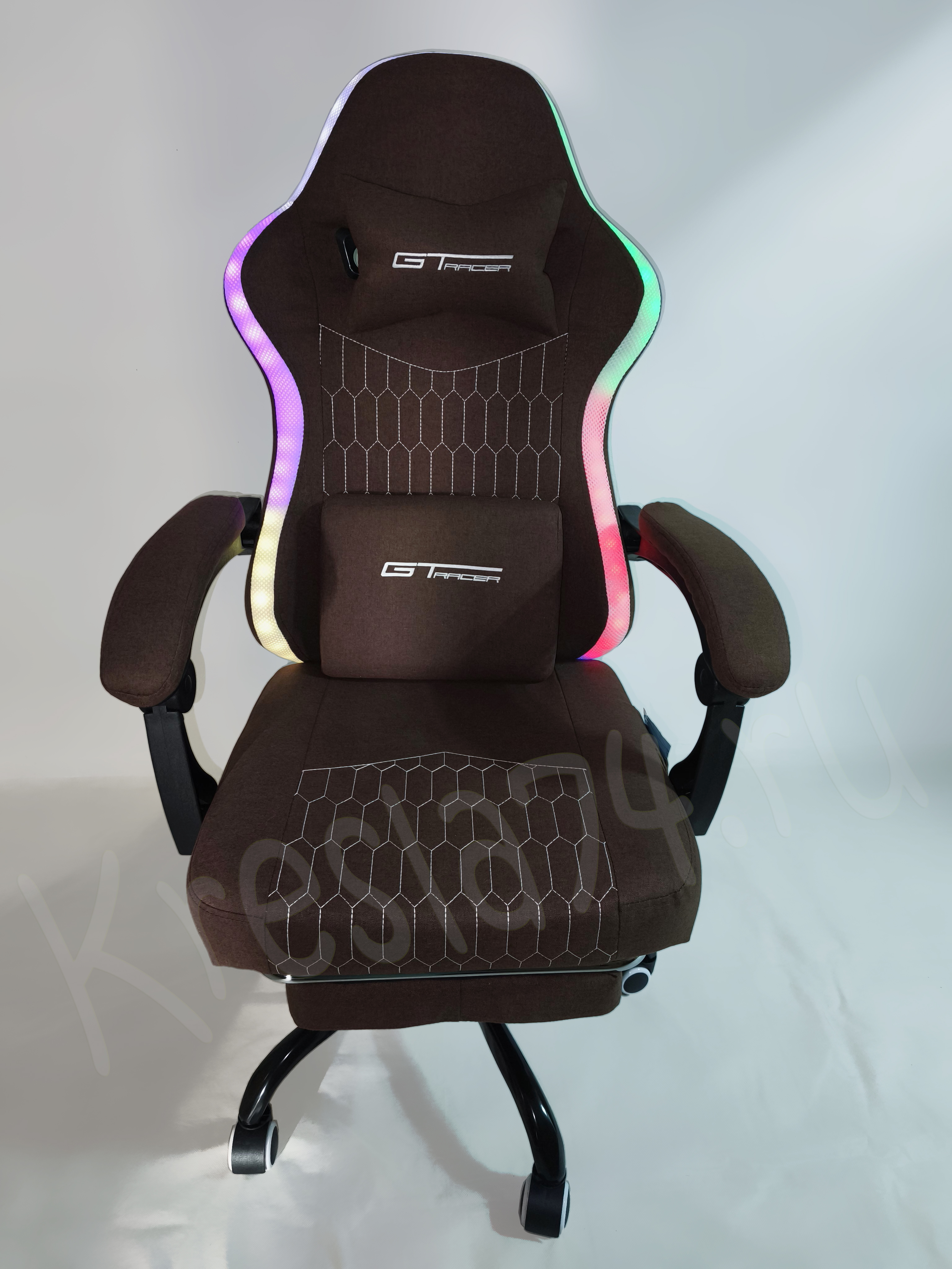 Геймерское кресло с ✨RGB подсветкой спинки, работающая от портативного зарядного устройства с разъёмом USB. Выполнено из ткани коричневого цвета.