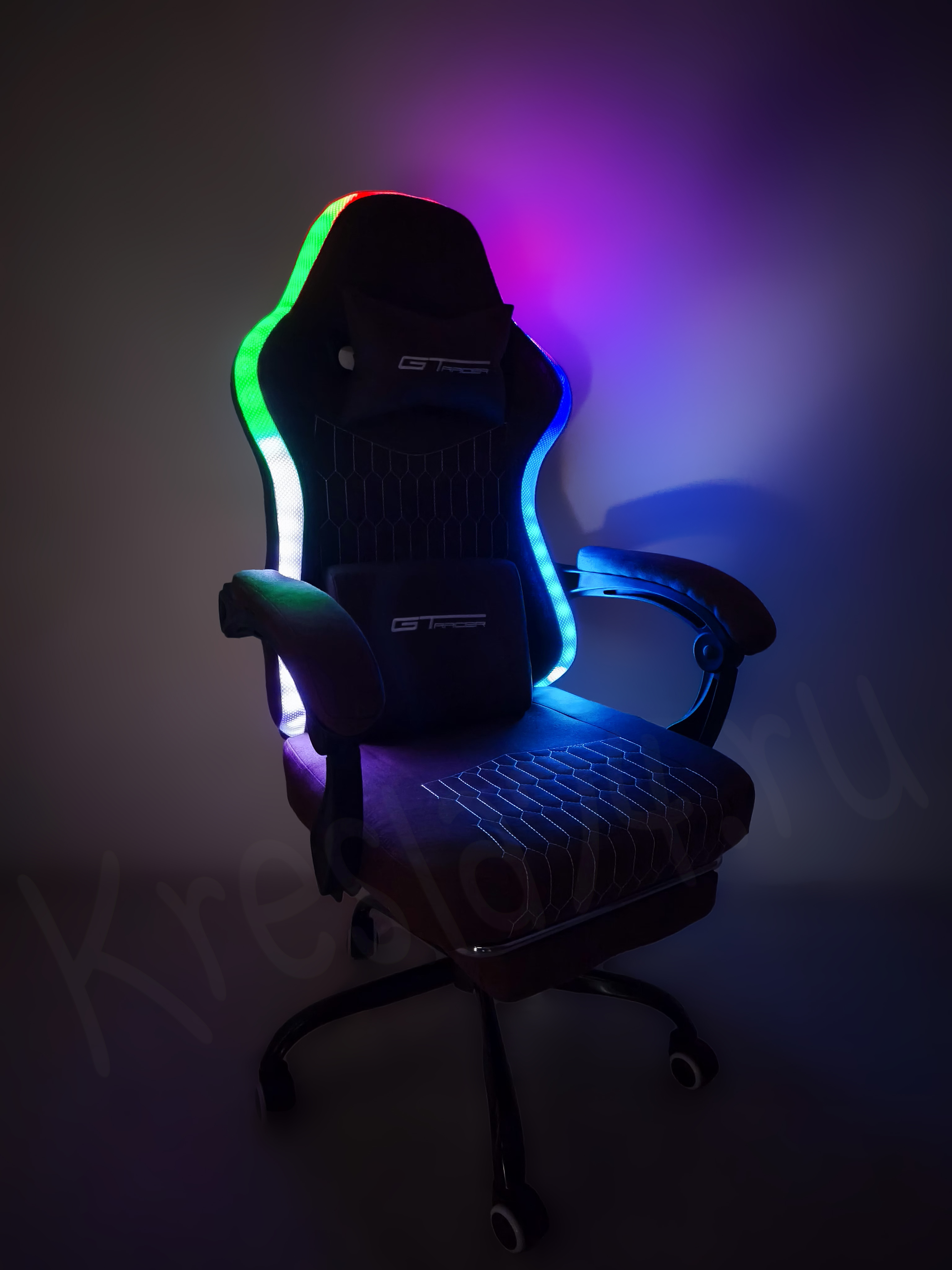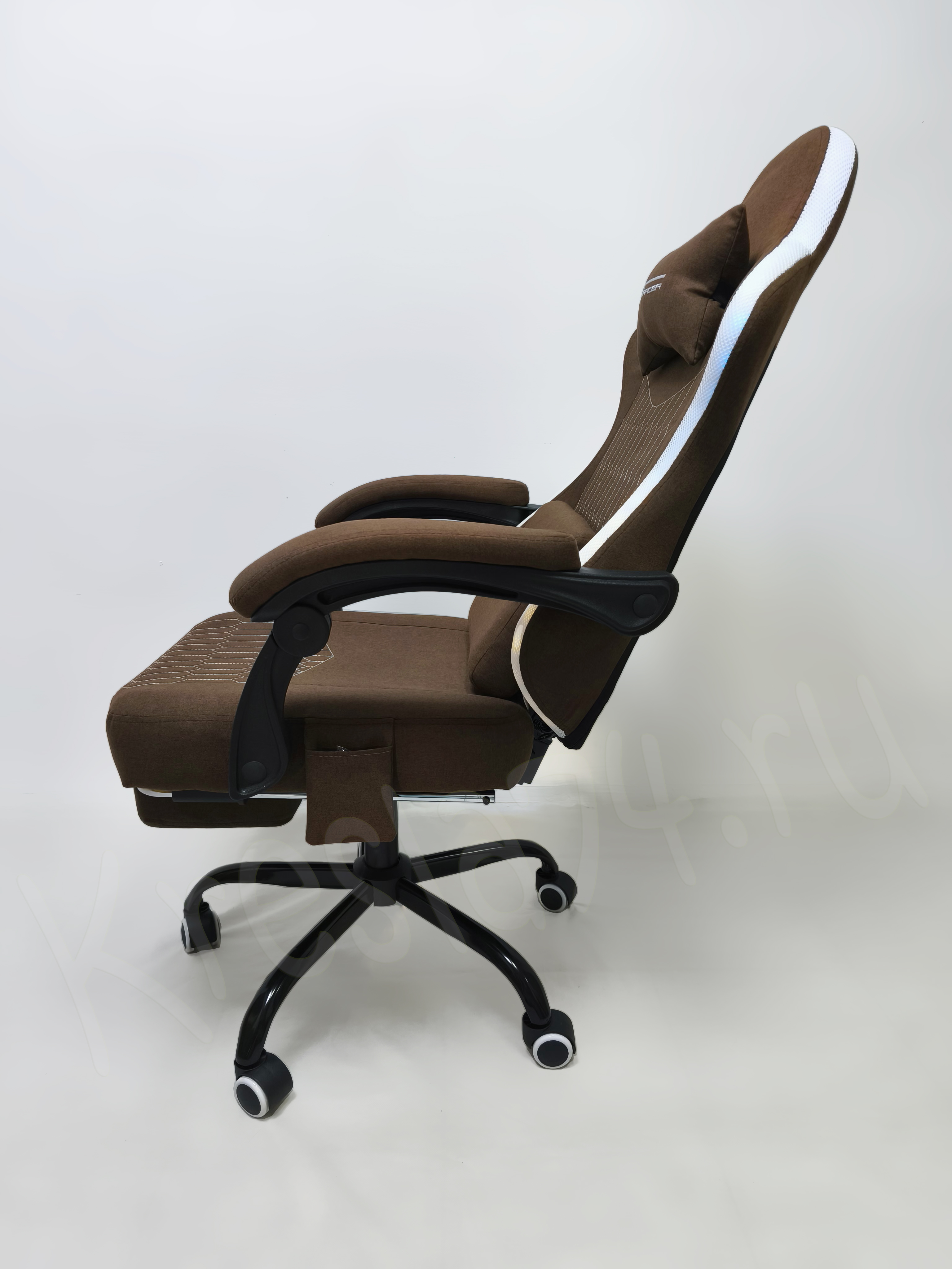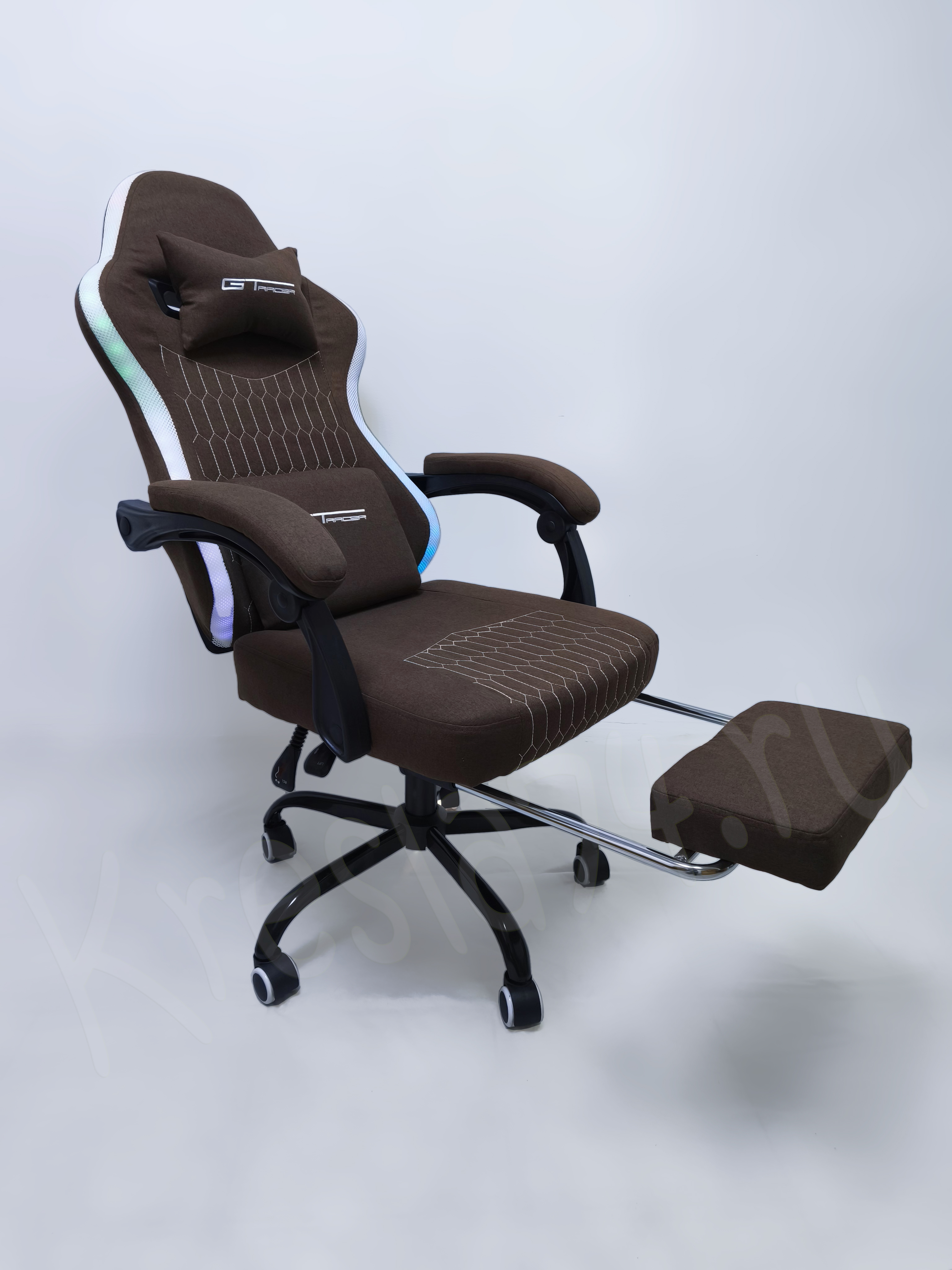 Геймерское кресло с ✨RGB подсветкой спинки, работающая от портативного зарядного устройства с разъёмом USB. Выполнено из ткани коричневого цвета.