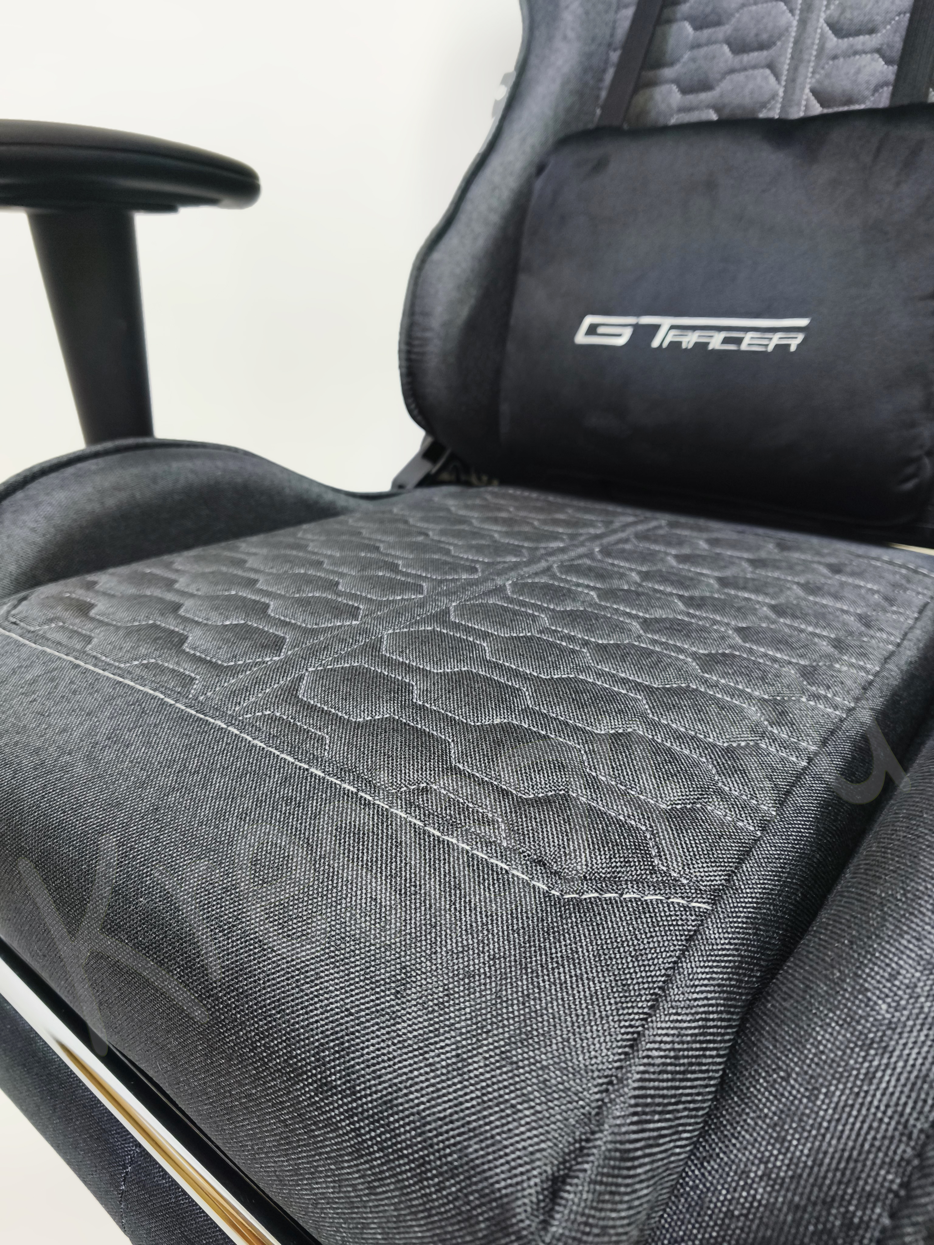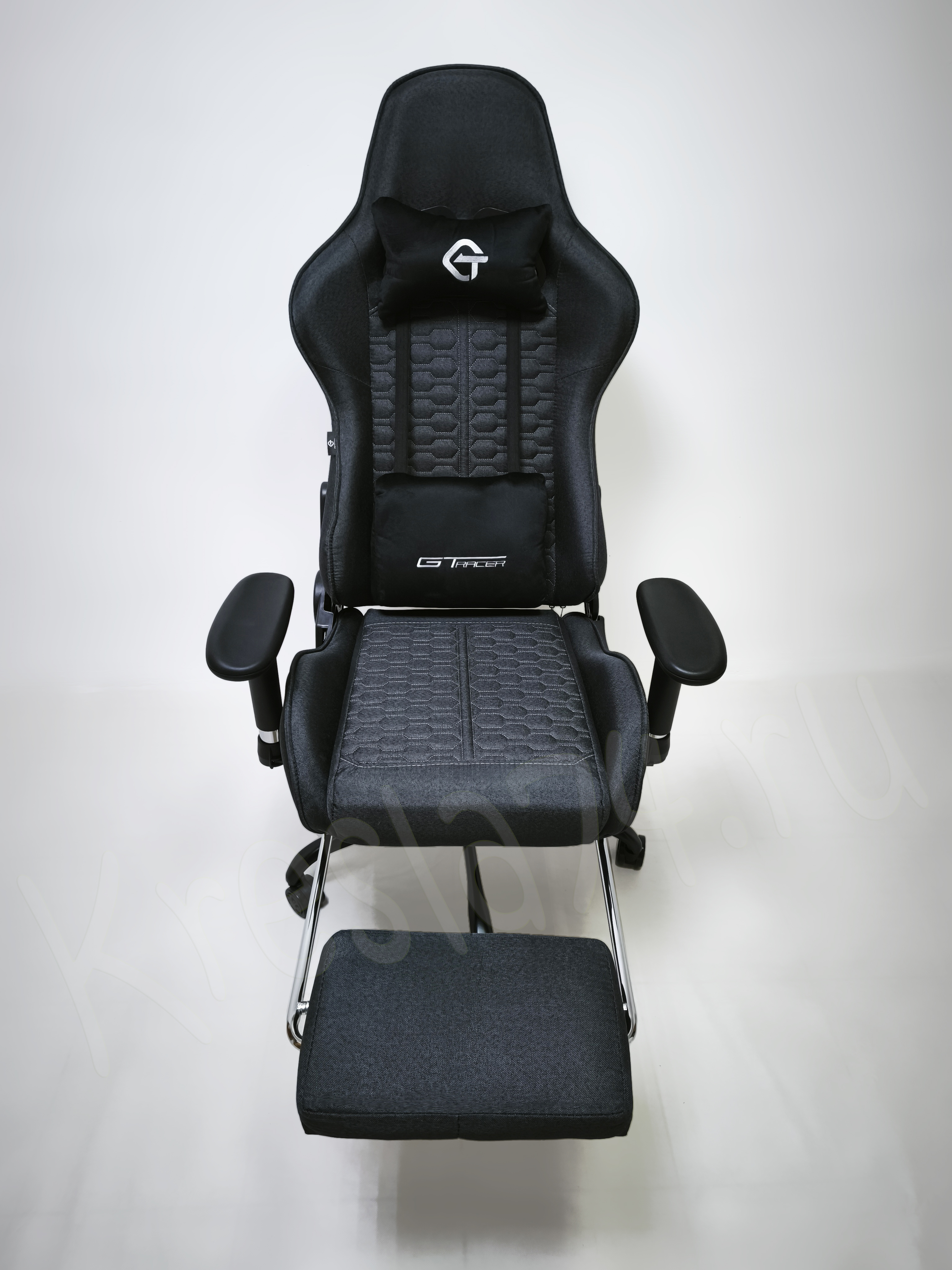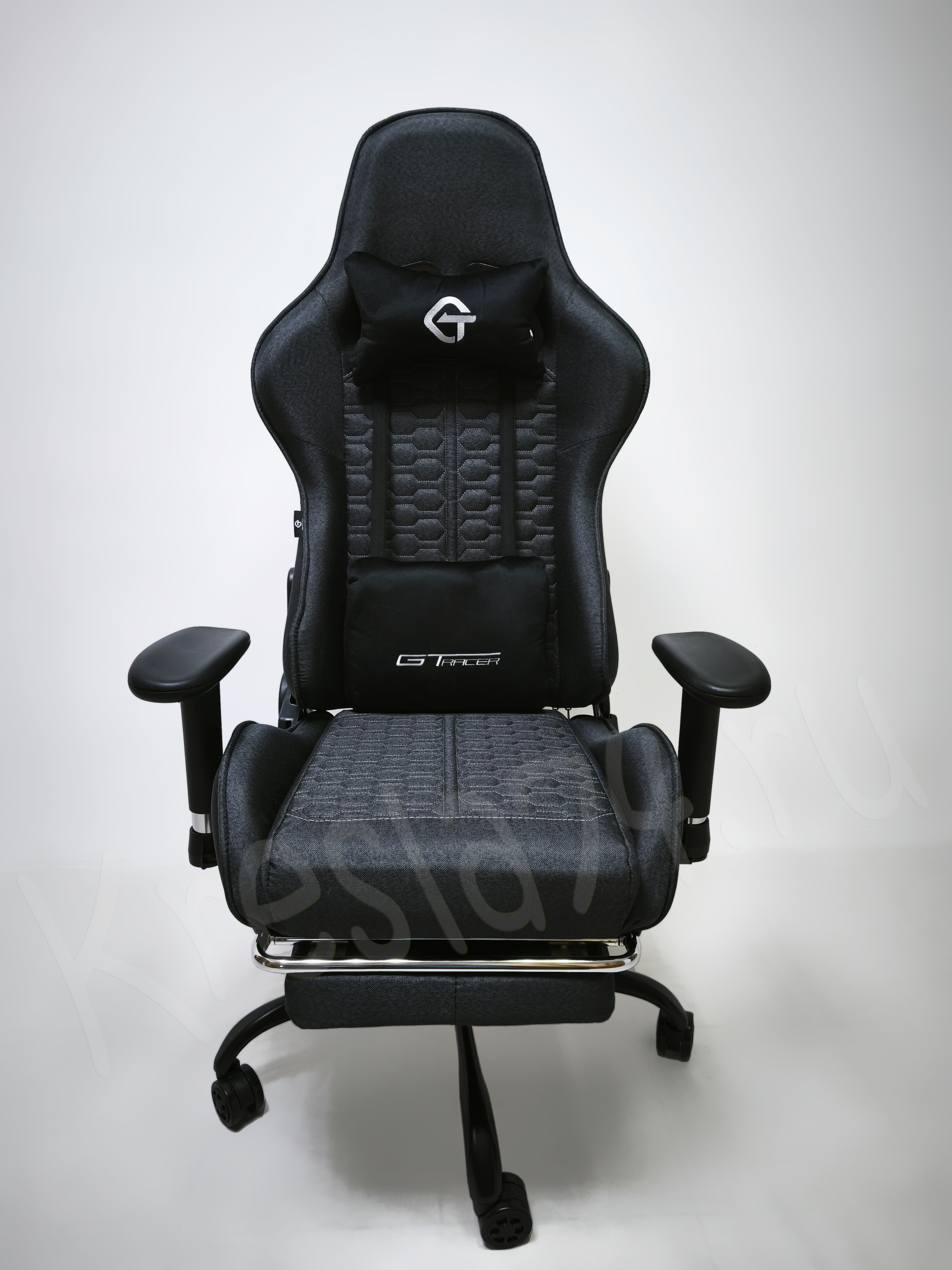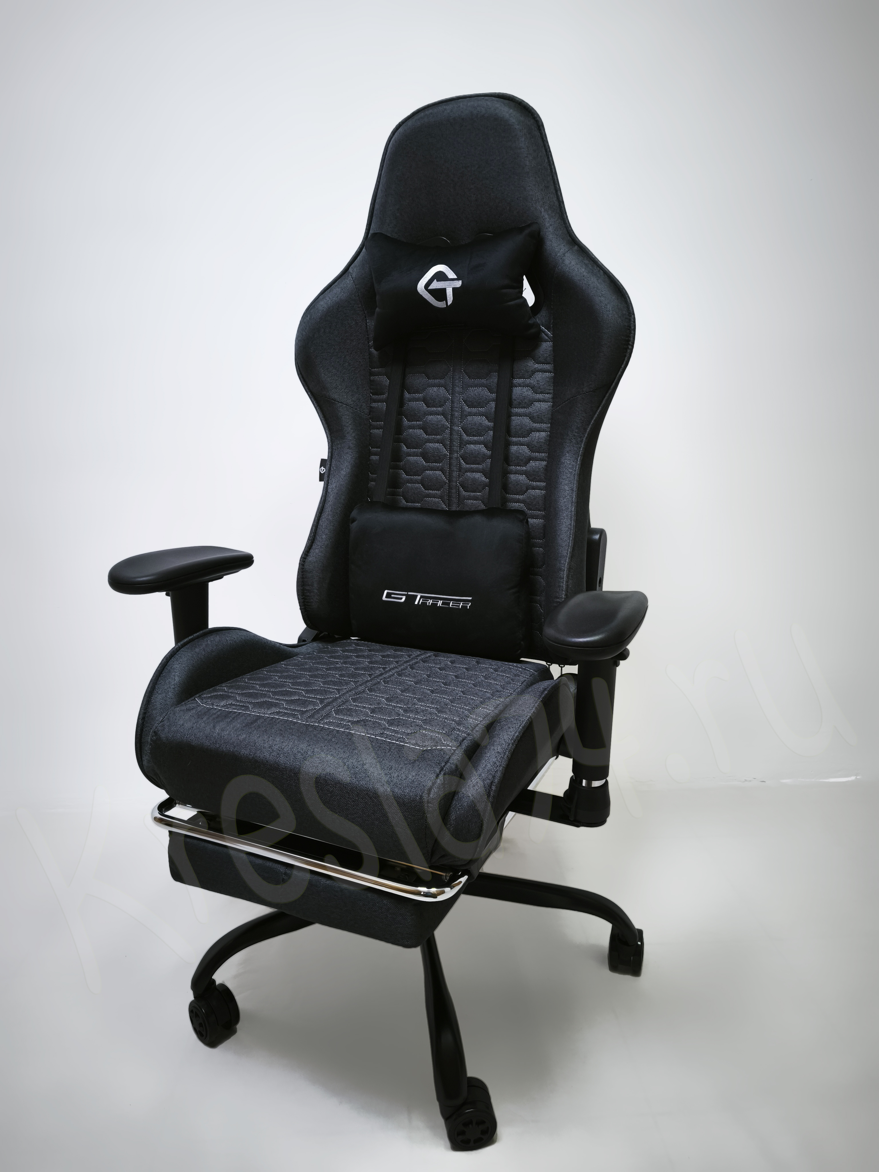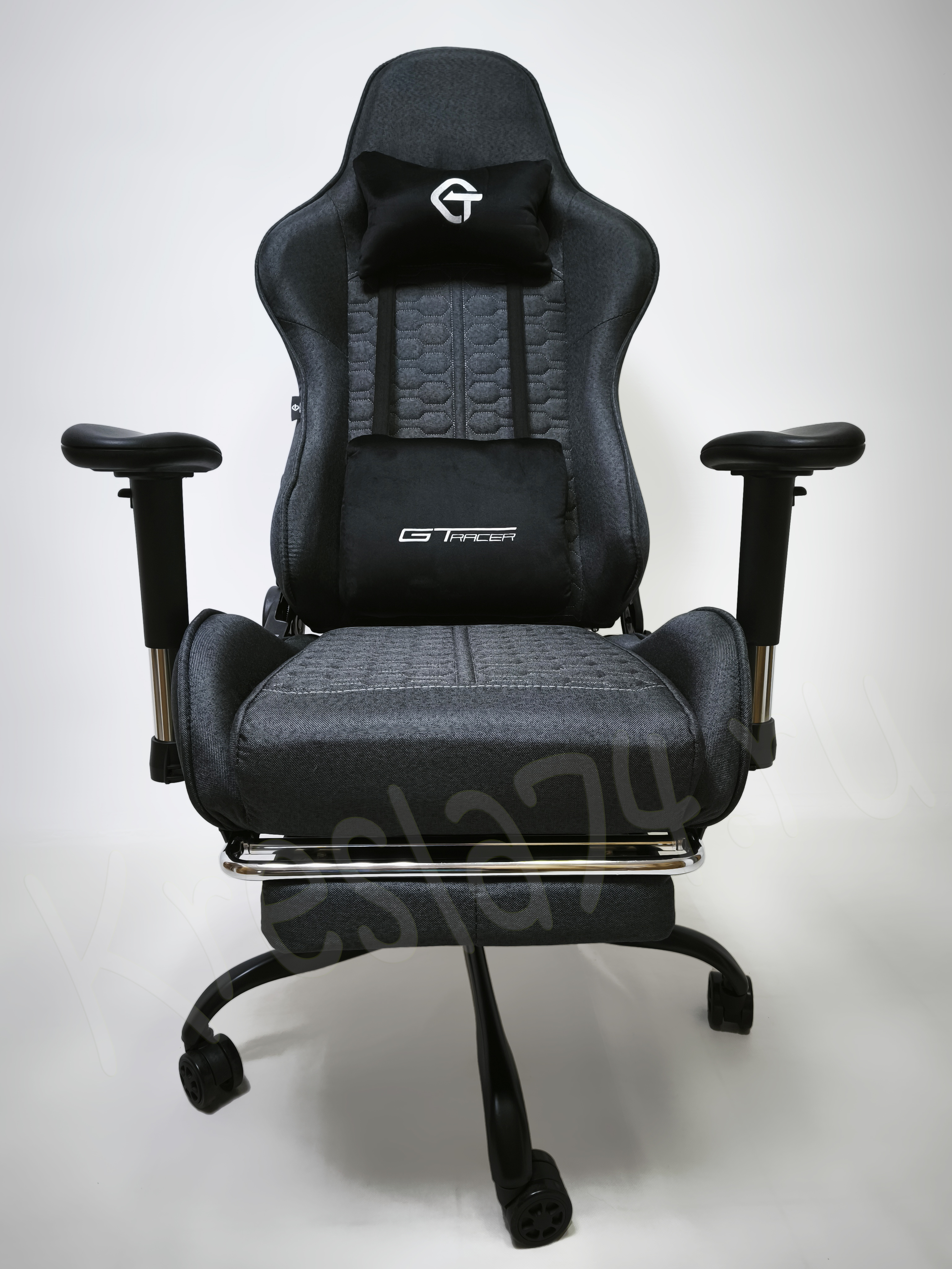 Эргономичное геймерское кресло серого цвета из ткани, с подножкой, подушкой под голову, подушкой под поясницу и режимом качания.
