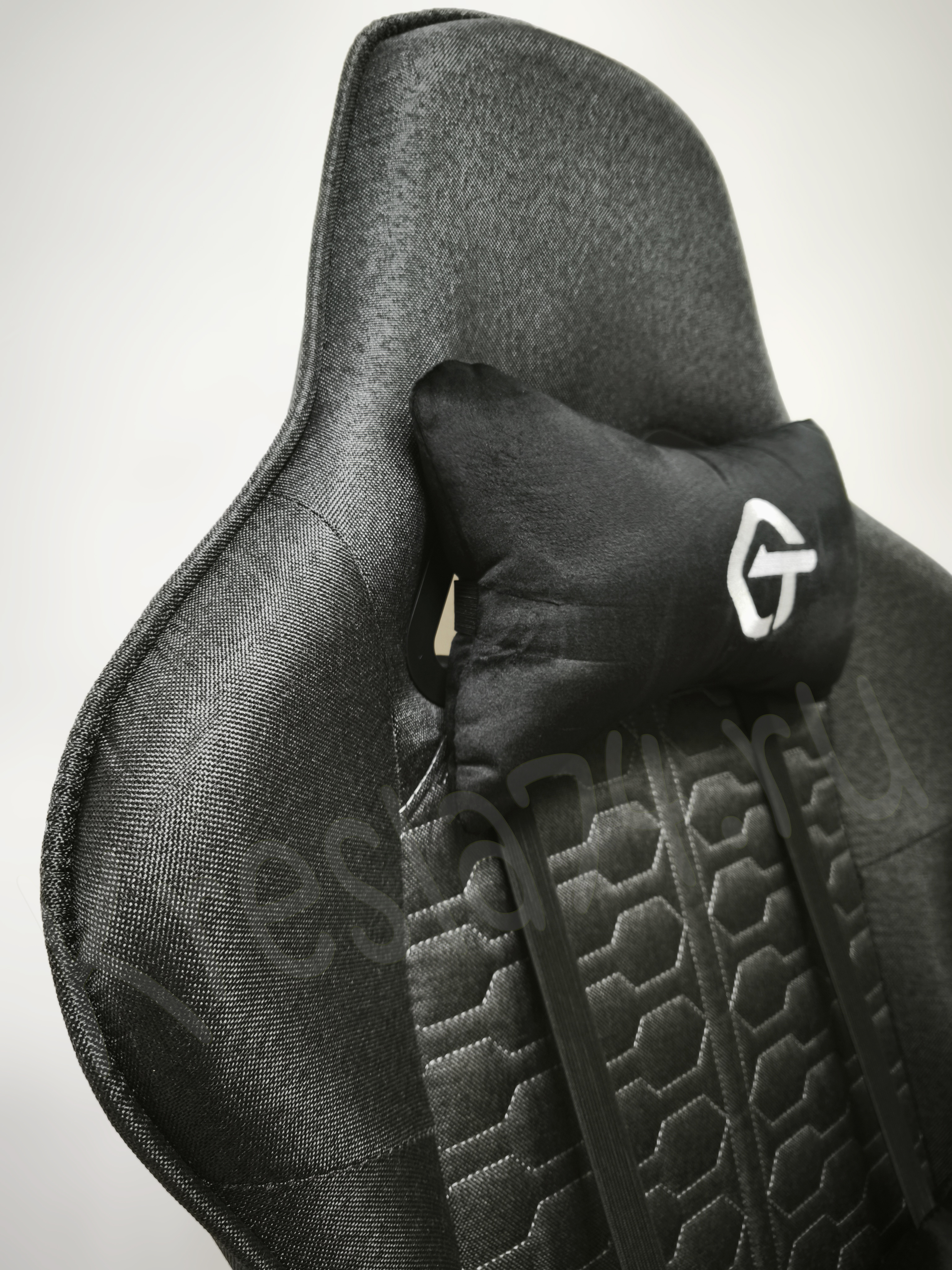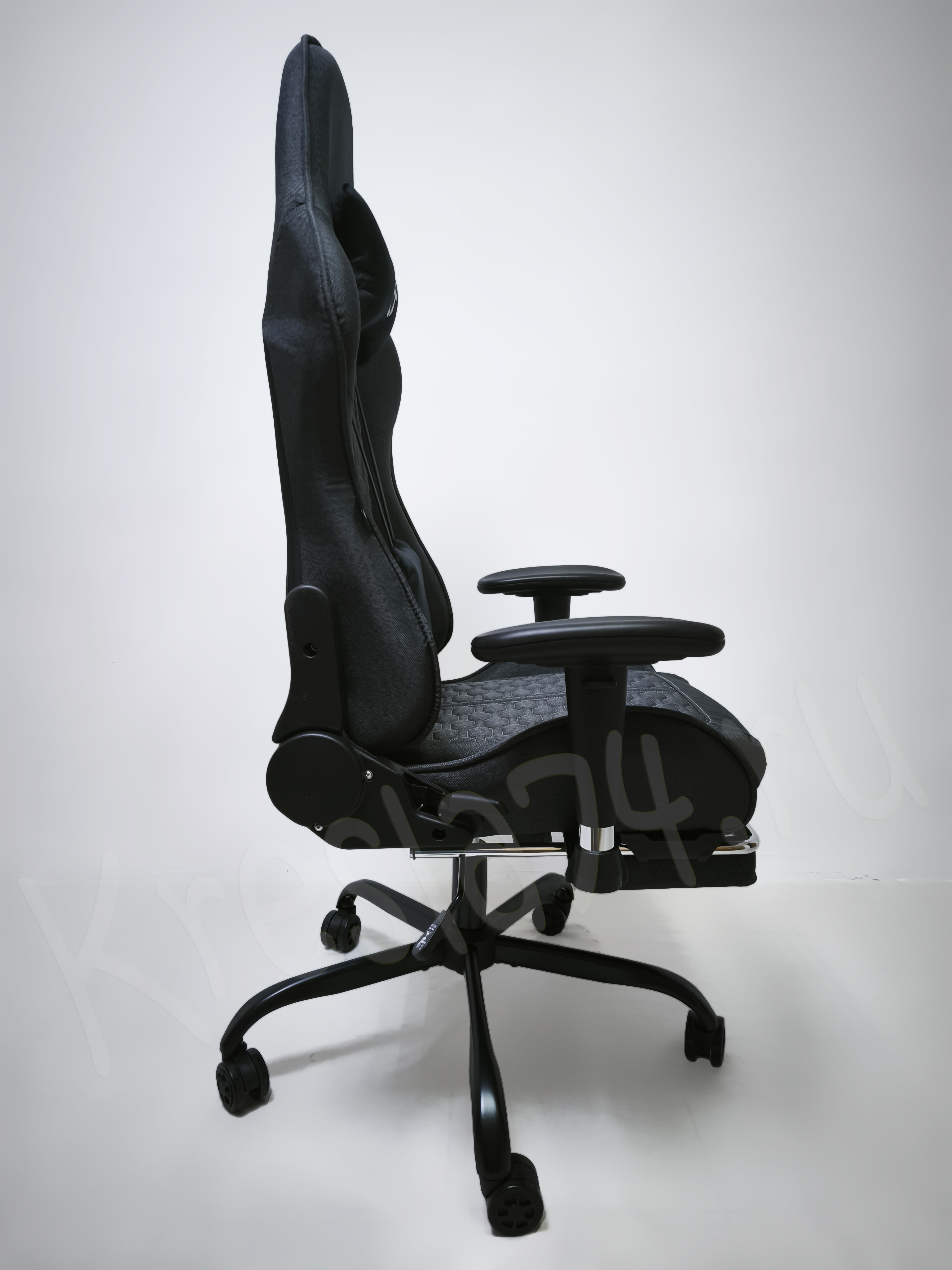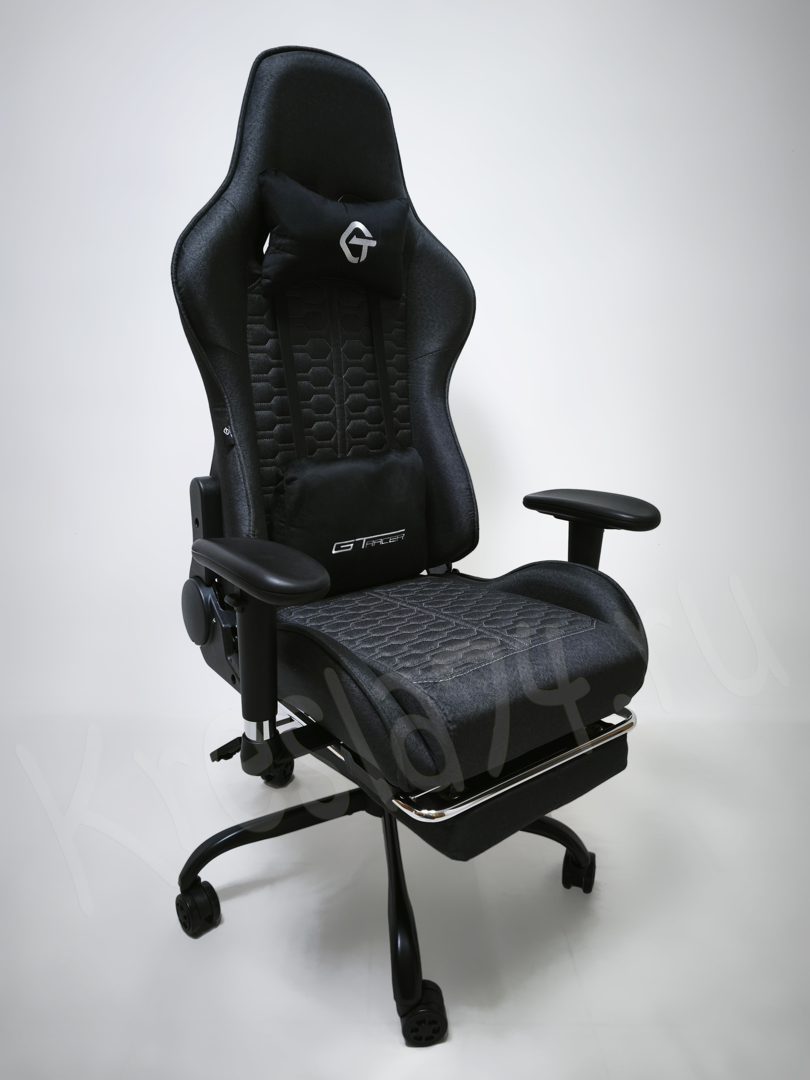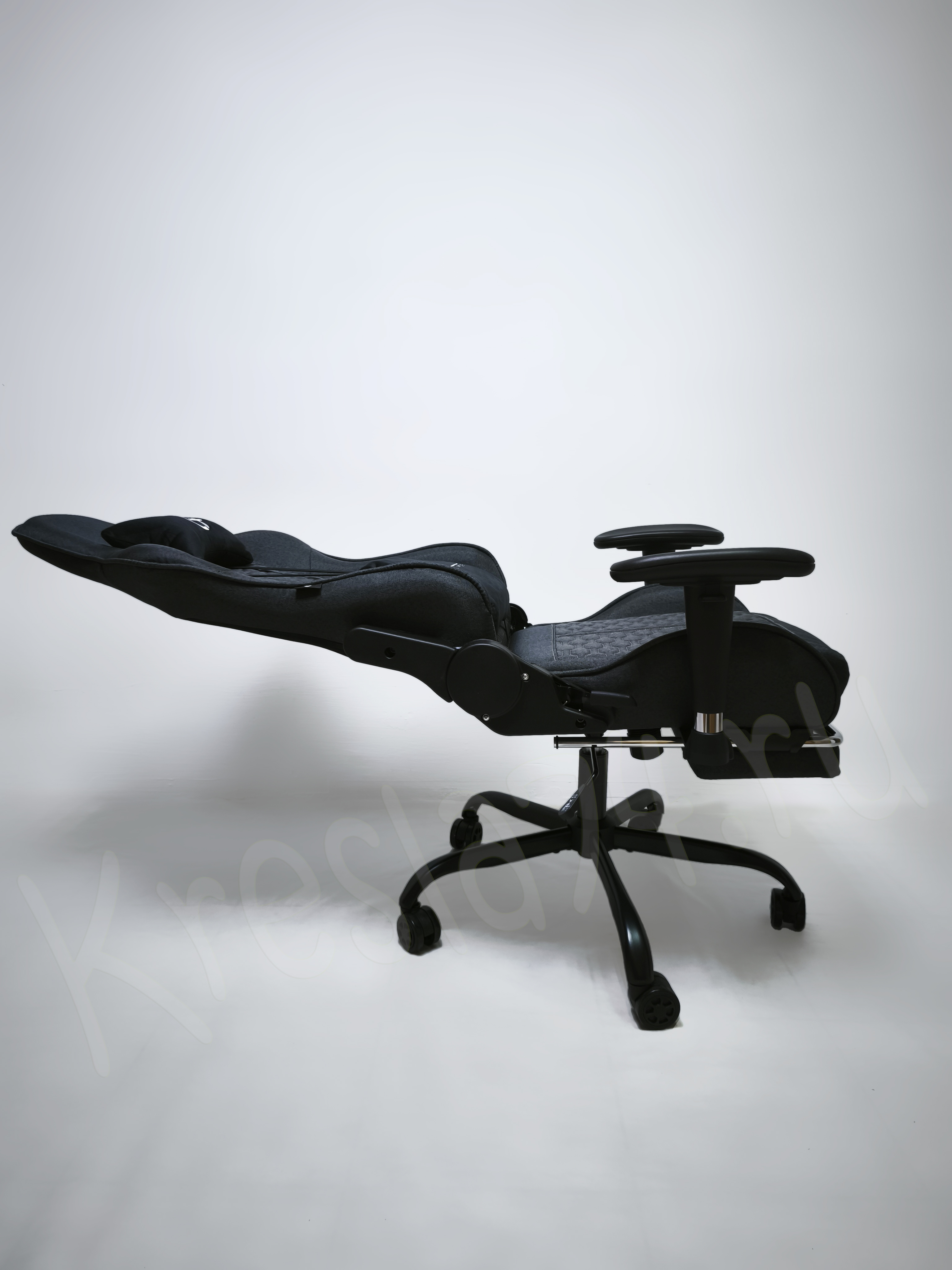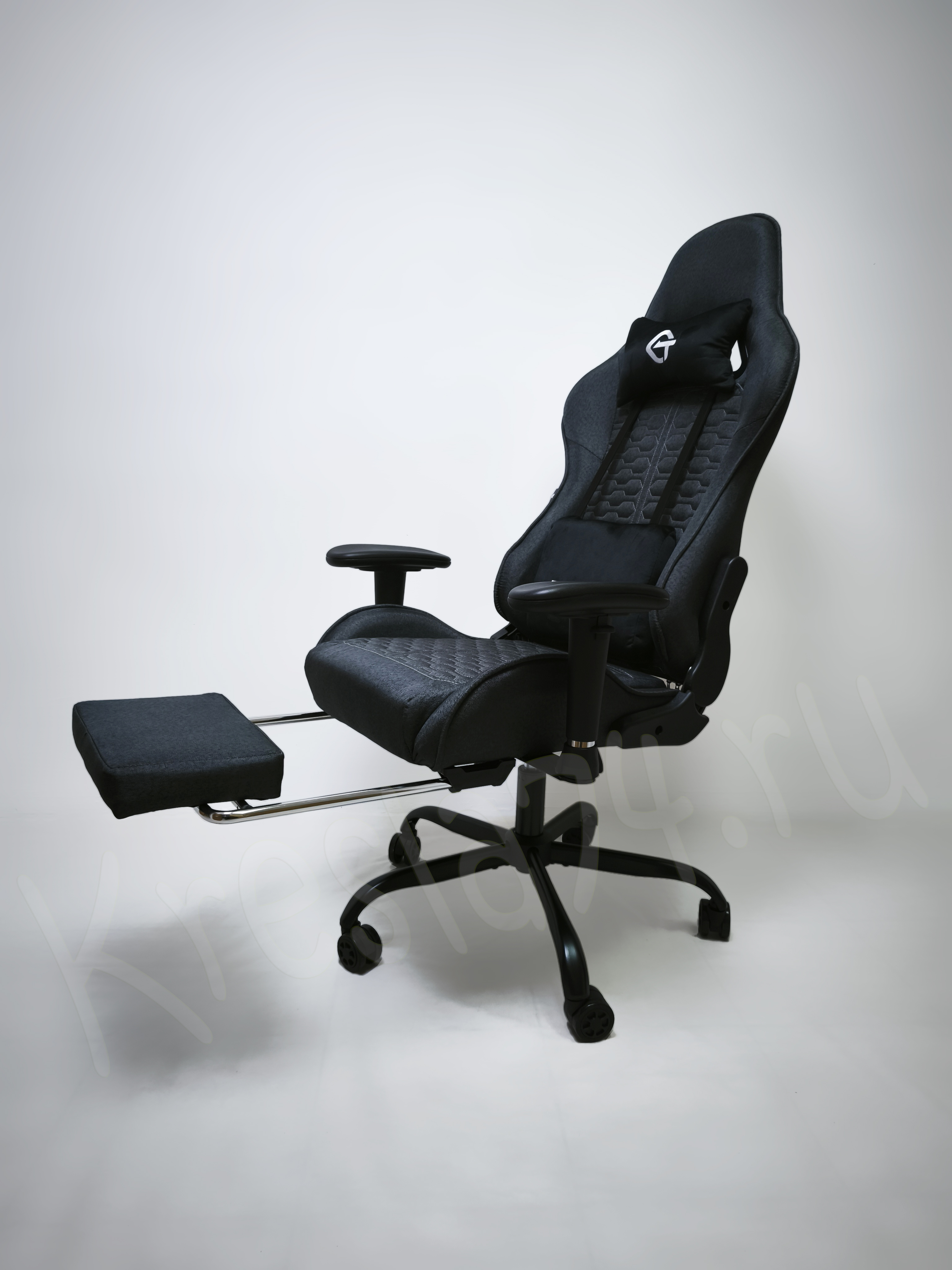 Эргономичное геймерское кресло серого цвета из ткани, с подножкой, подушкой под голову, подушкой под поясницу и режимом качания.