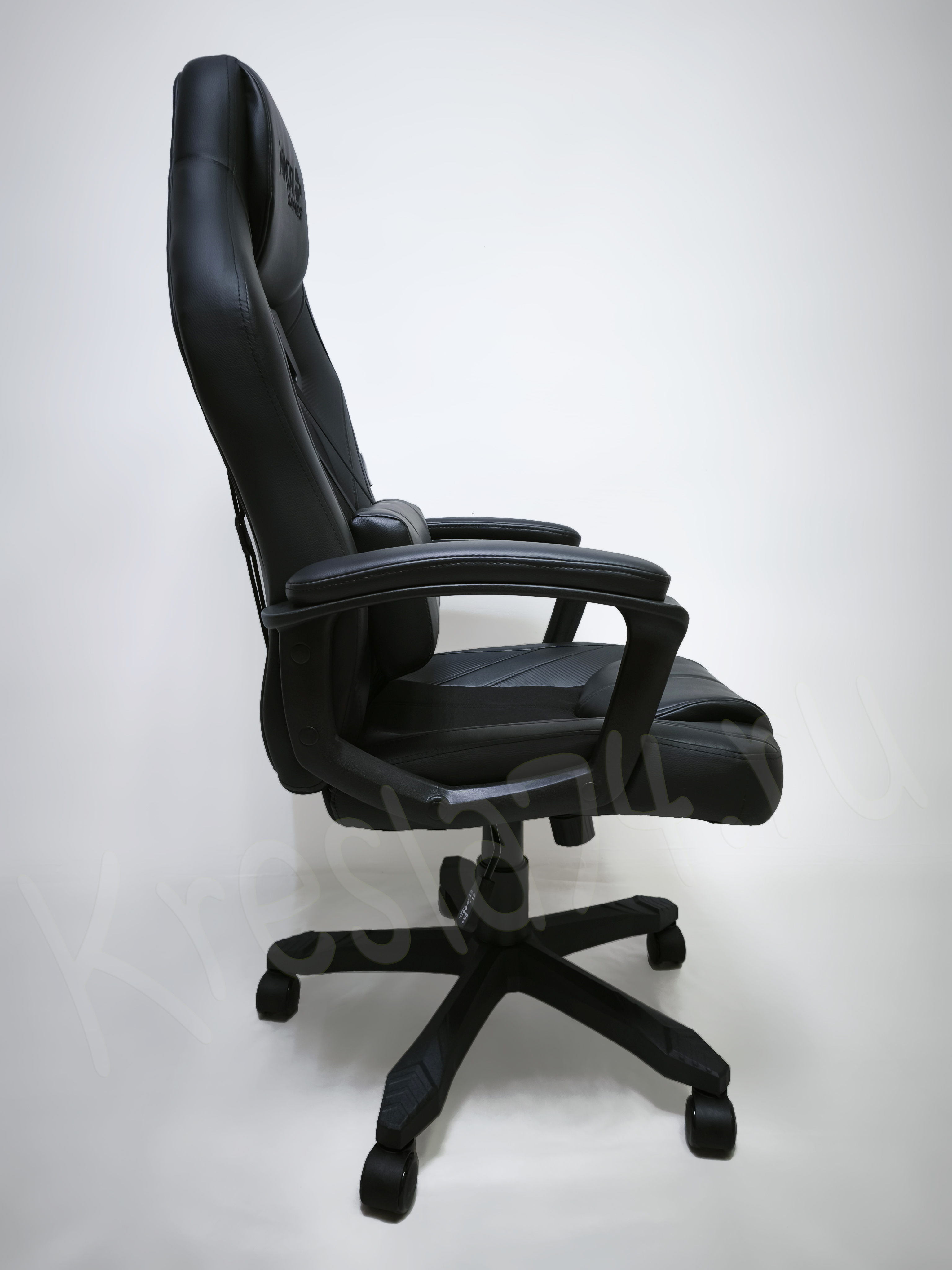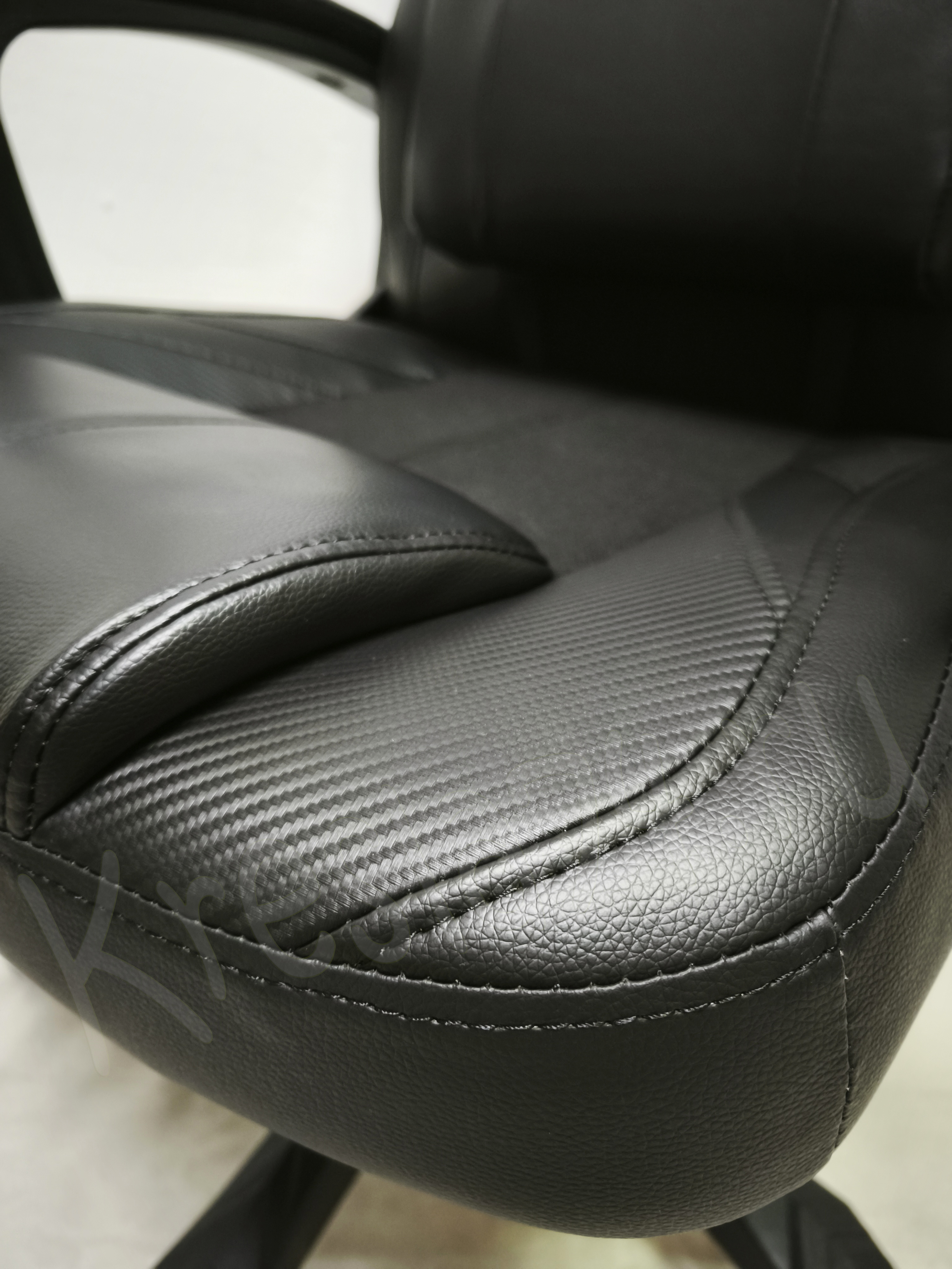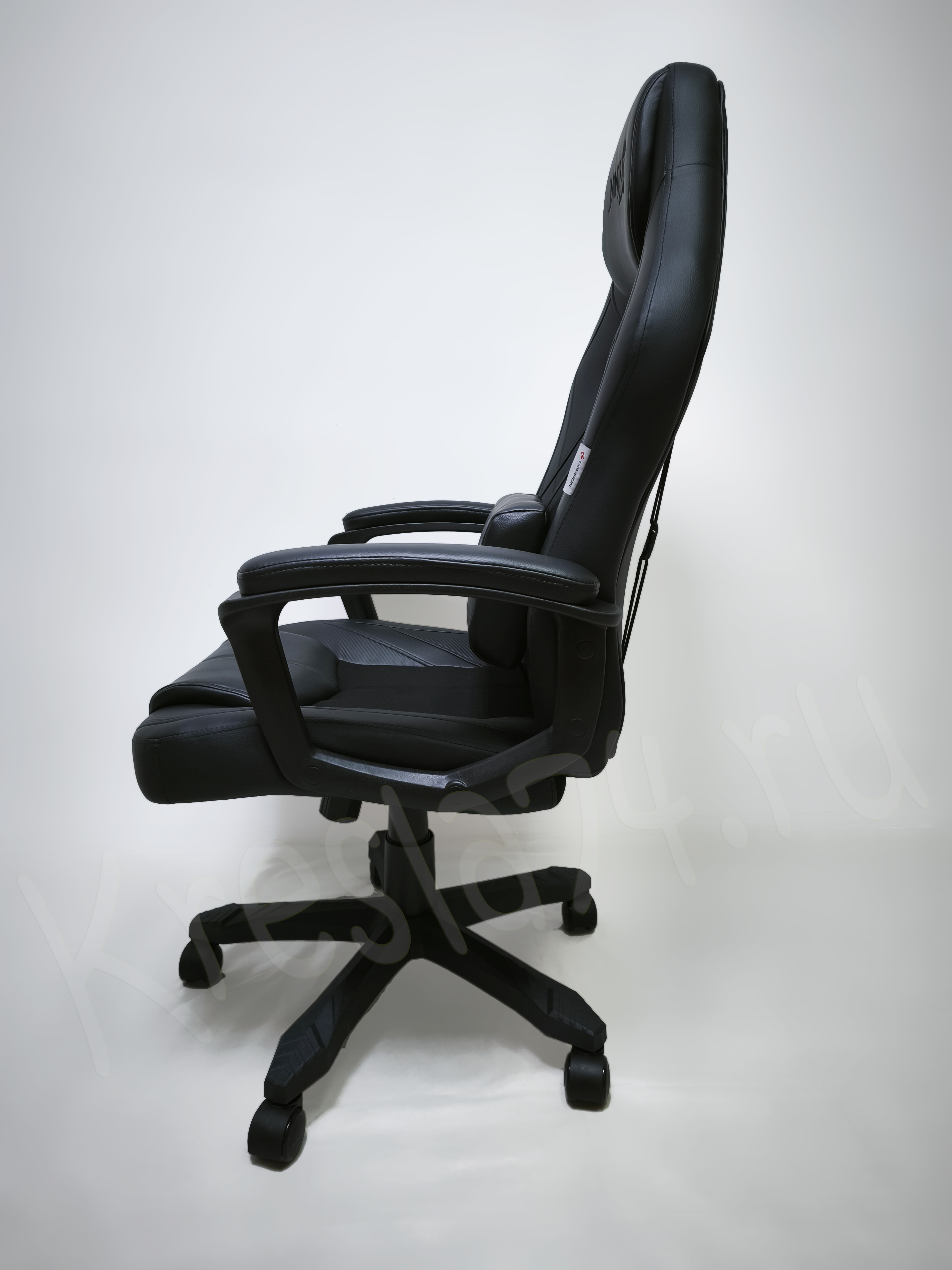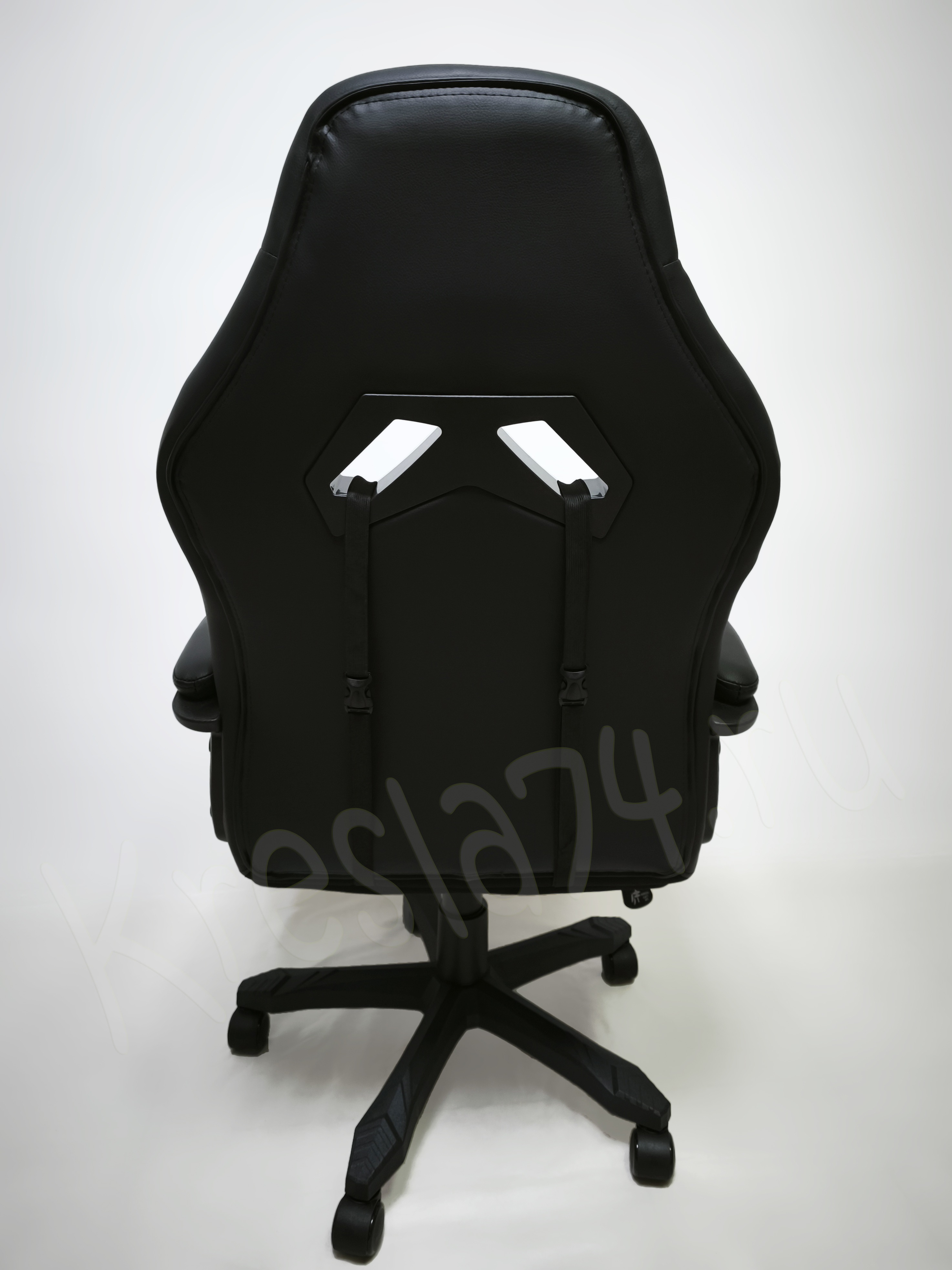 Компьютерное - игровое кресло с режимом качания. Выполнено из приятной на ощупь эко-кожи черной расцветки со вставками из ткани на спинке и сиденье.