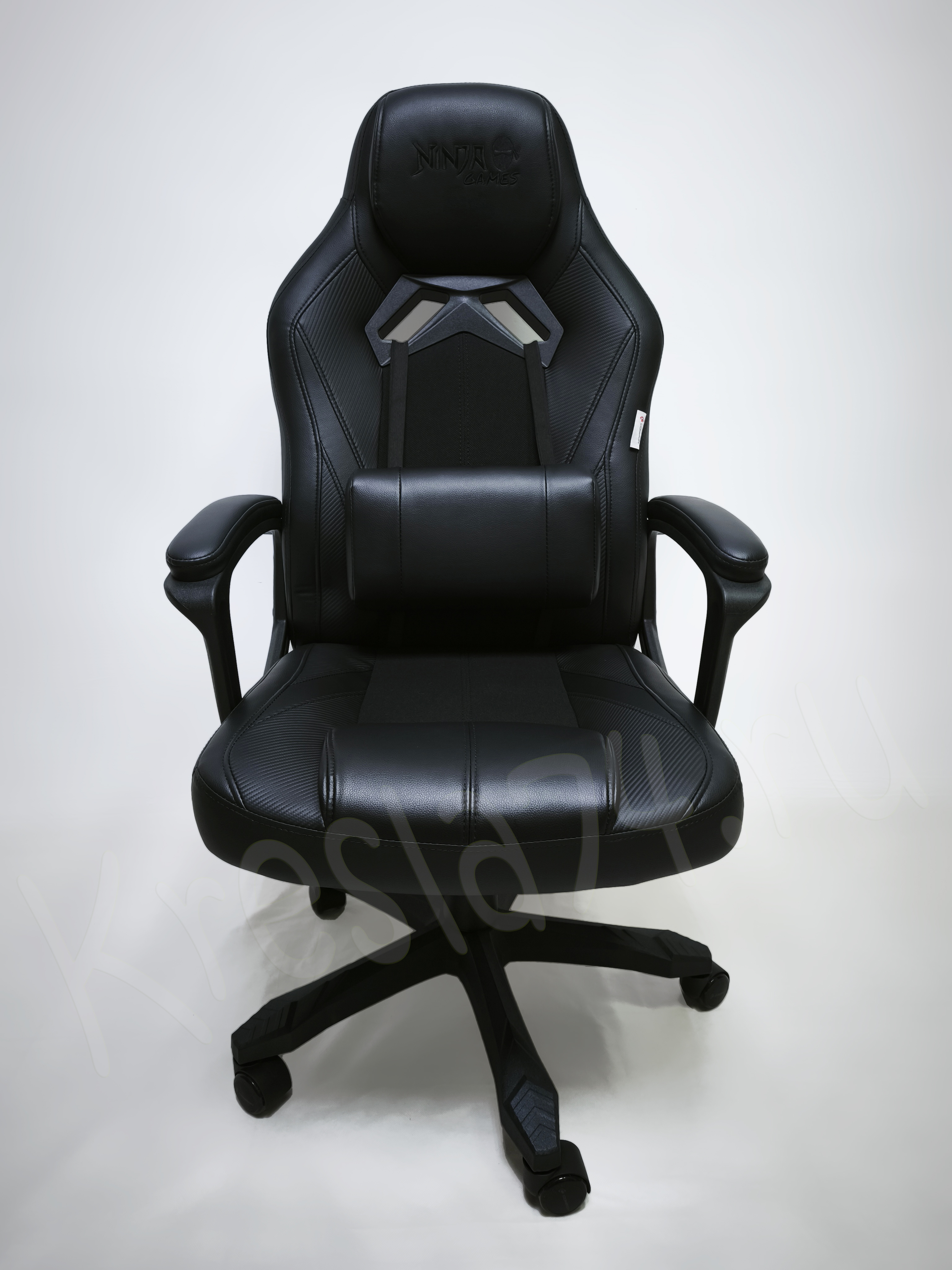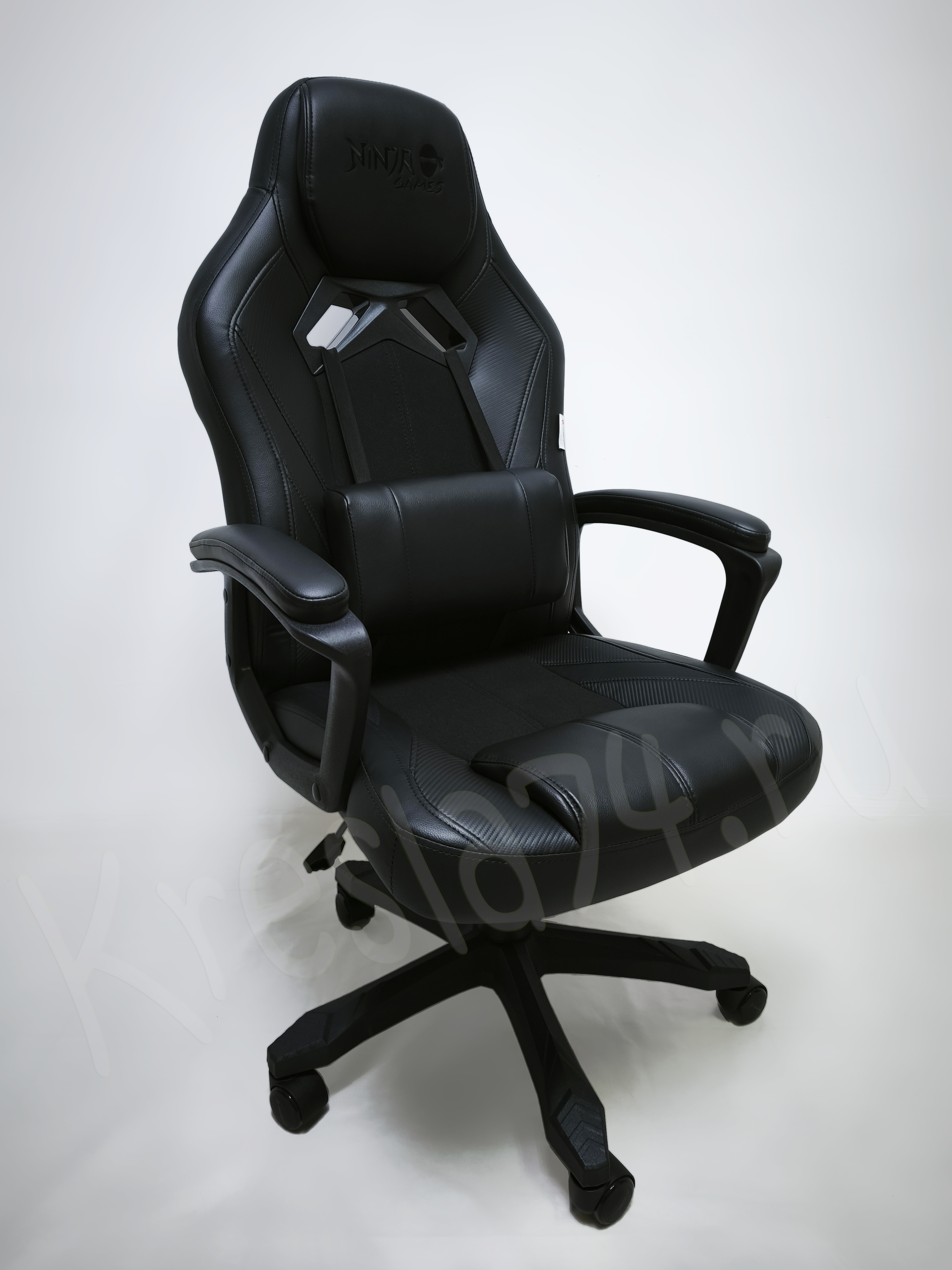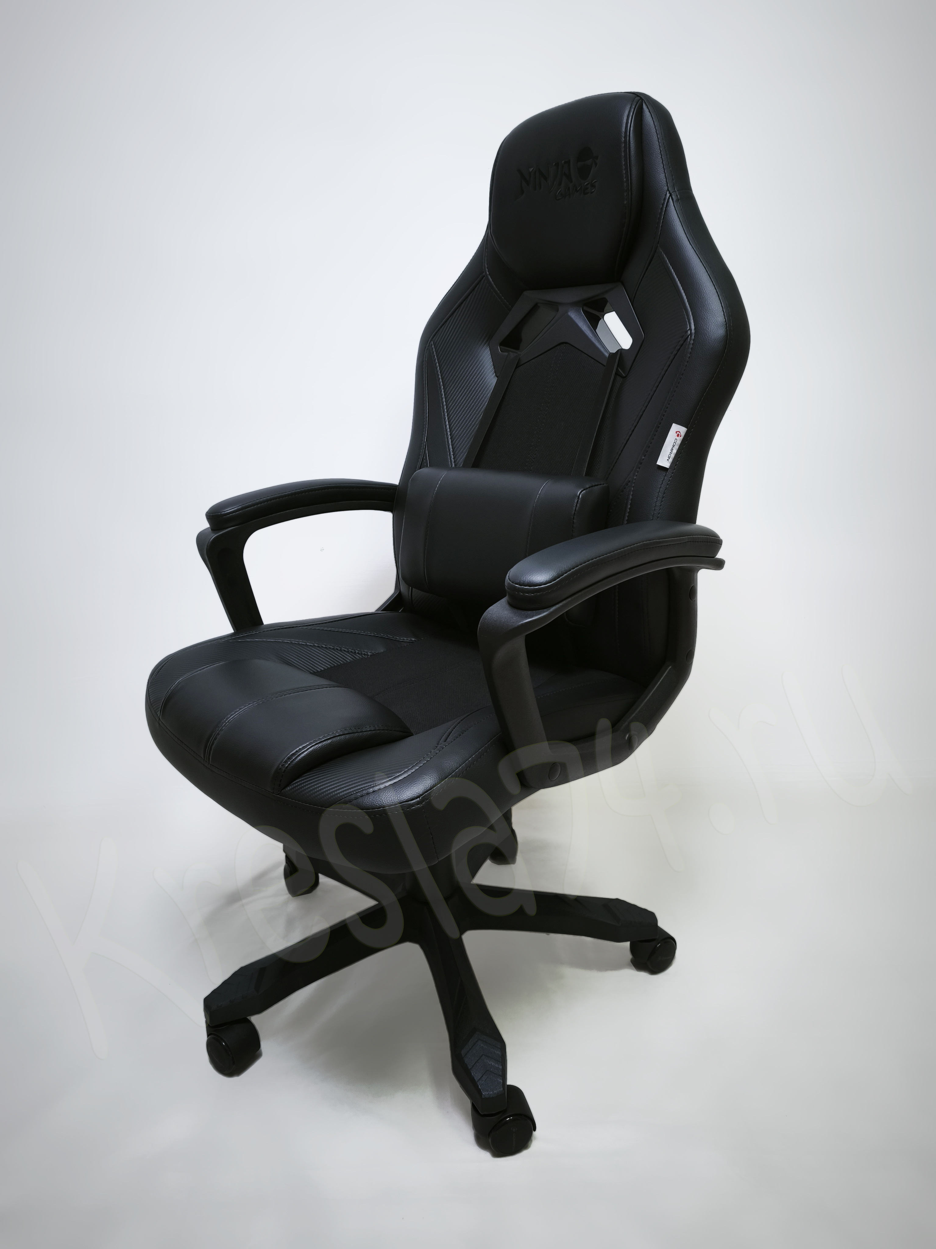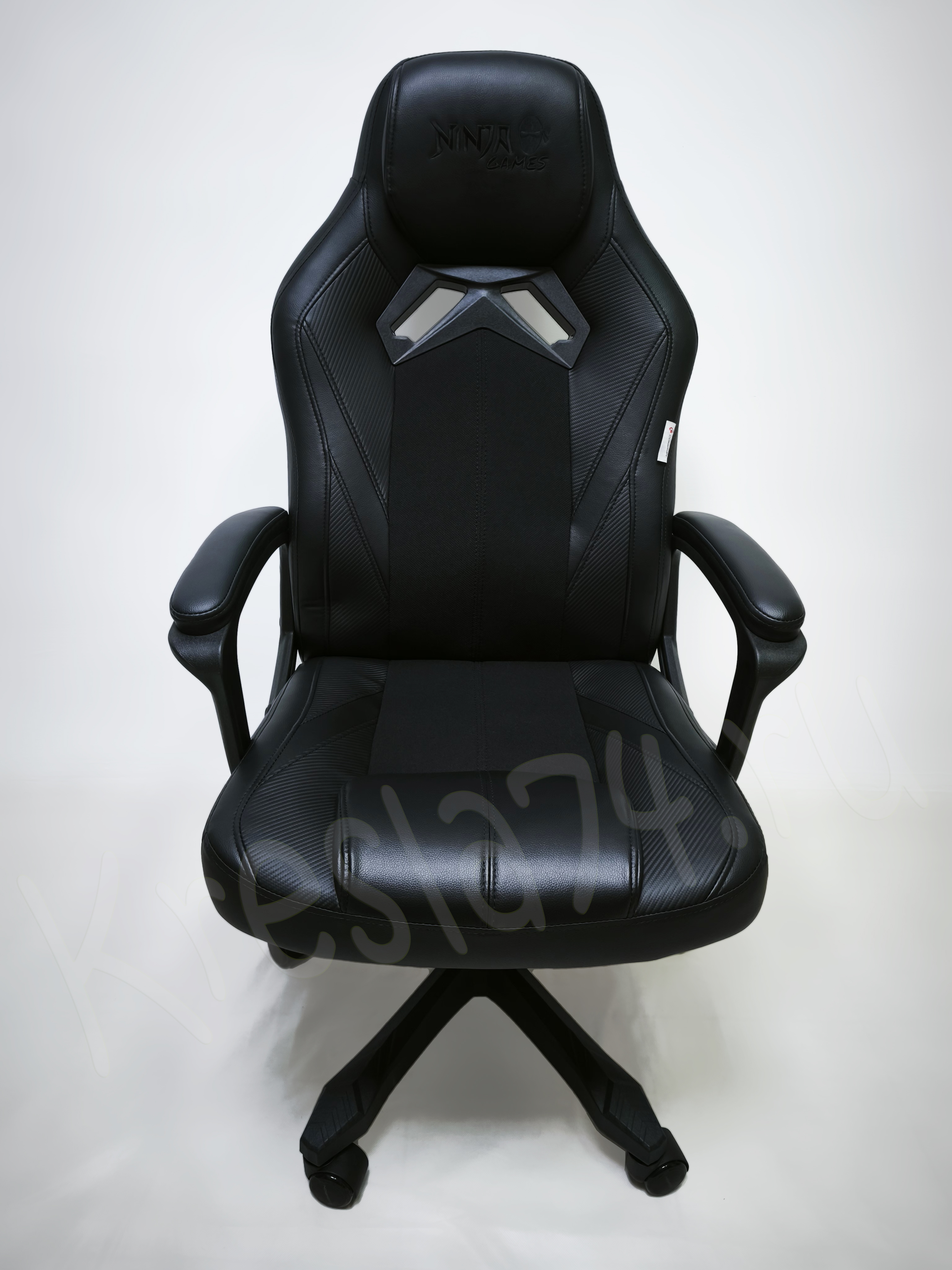 Компьютерное - игровое кресло с режимом качания. Выполнено из приятной на ощупь эко-кожи черной расцветки со вставками из ткани на спинке и сиденье.